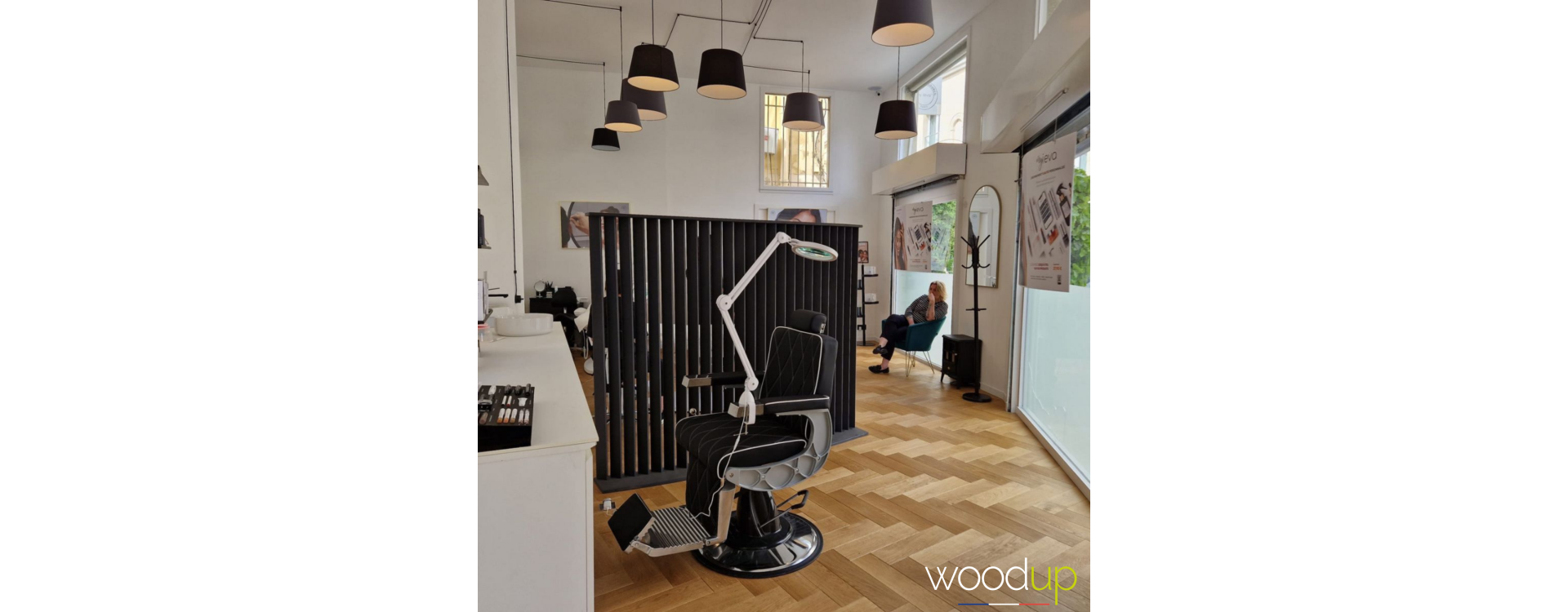 Ces séparations modernes et raffinées structurent l’espace avec discrétion, tout en préservant la luminosité et la fluidité du lieu. Leur finition noire contraste harmonieusement avec le parquet clair en chevrons et l’ambiance sobre et élégante du salon. Plus qu’un simple élément d’agencement, ces claustras deviennent une signature déco qui reflète parfaitement l’image haut de gamme de la marque.