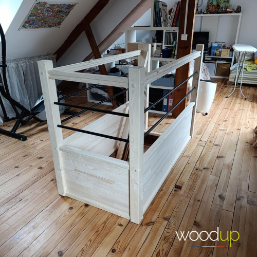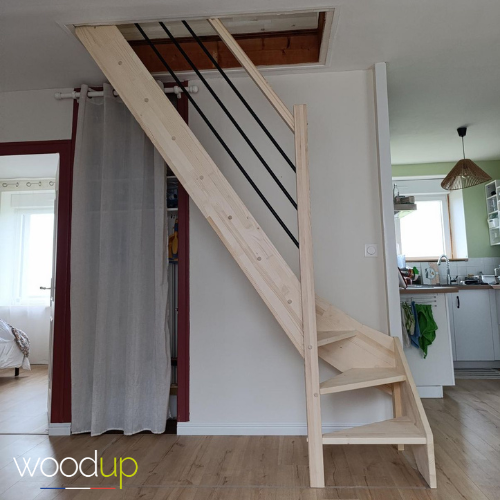 " Contrainte par une trémie ne pouvant être agrandie et ne mesurant que 60 cm de large sur 145 cm de long, et disposant d'un budget limité, j'ai fait appel à Woodup pour la confection d'un escalier quart tournant sur-mesure ainsi que du garde-corps assorti. J'avais un peu peur à cause de la prise de mesures de mon côté, mais au final tout va bien et est parfait ! L'installation s'est déroulée sans encombre et je suis vraiment satisfaite du résultat ! Merci à toute l'équipe ?"