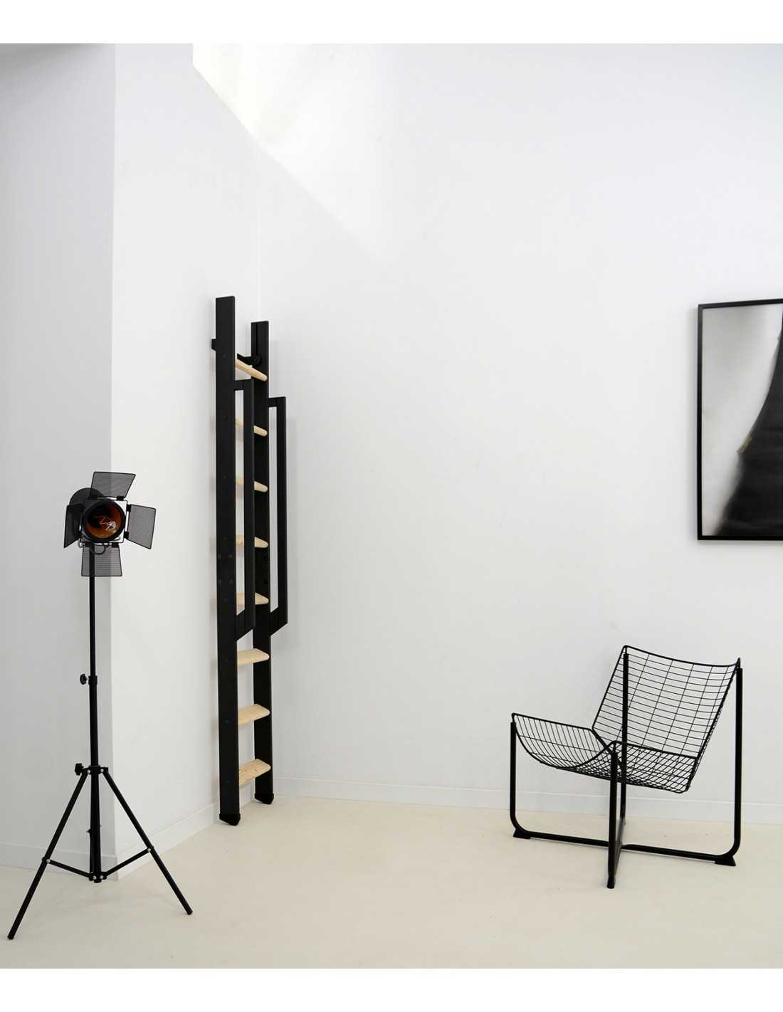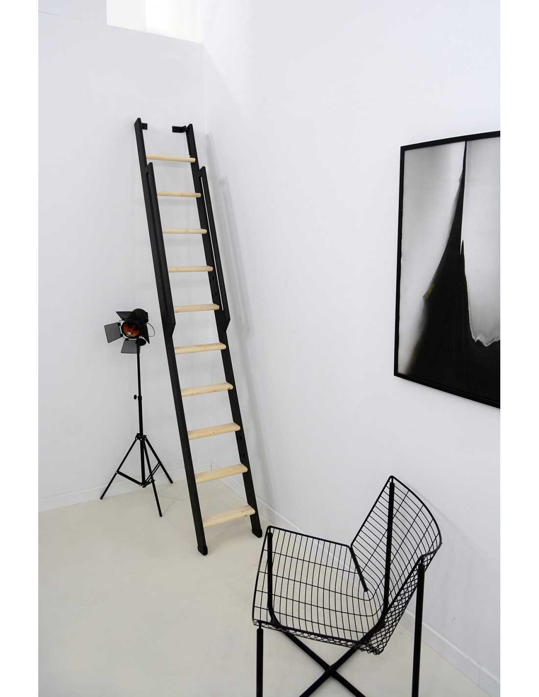 La escalera de entresuelo Strong es una solución compacta diseñada para accesos en altura hasta 2 900 mm según modelo. Disponible en 8, 10 o 12 peldaños, combina peldaños de madera maciza (abeto o haya) con largueros de acero termolacado negro o blanco. Su inclinación de 70° reduce el espacio ocupado en el suelo y su sistema permite un reposicionamiento vertical después del uso. Adaptada para uso interior, soporta una carga máxima de 200 kg.