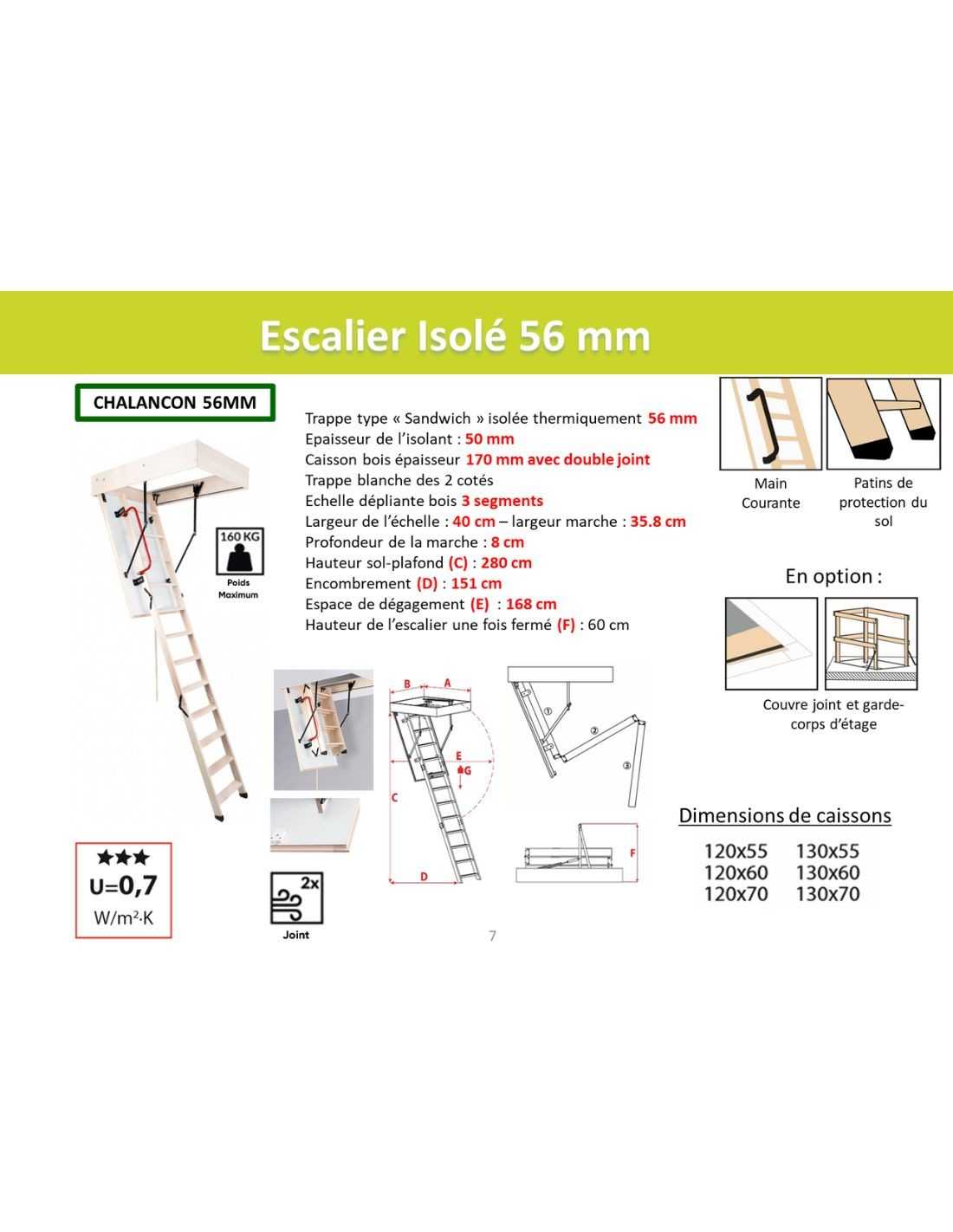 Acceda a su desván fácilmente gracias a esta escalera escamoteable de madera aislada. Su trampilla sándwich de 56 mm, con un aislante integrado de 50 mm, garantiza un excelente aislamiento térmico (U = 0.7 W/m².K). Entregada con un pasamanos y patines de protección para el suelo, asegura una seguridad óptima. Adaptada a alturas de techo de hasta 2m80, esta escalera compacta está equipada con 3 segmentos plegables y peldaños anchos para mayor comodidad de uso. Su trampilla blanca puede pintarse para integrarse en su decoración. Dimensiones disponibles: 120x55, 120x60, 120x70 cm y 130x55, 130x60, 130x70 cm.