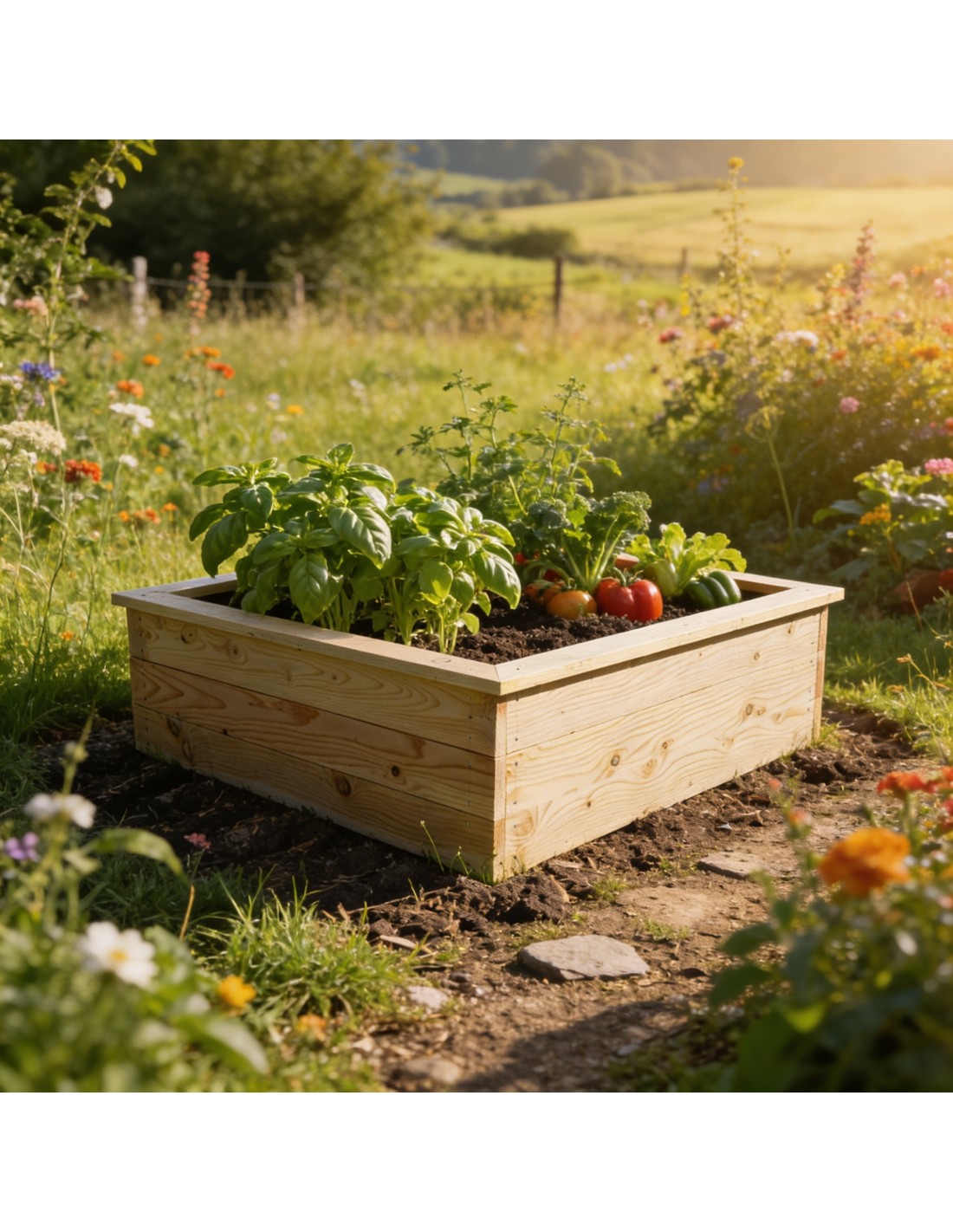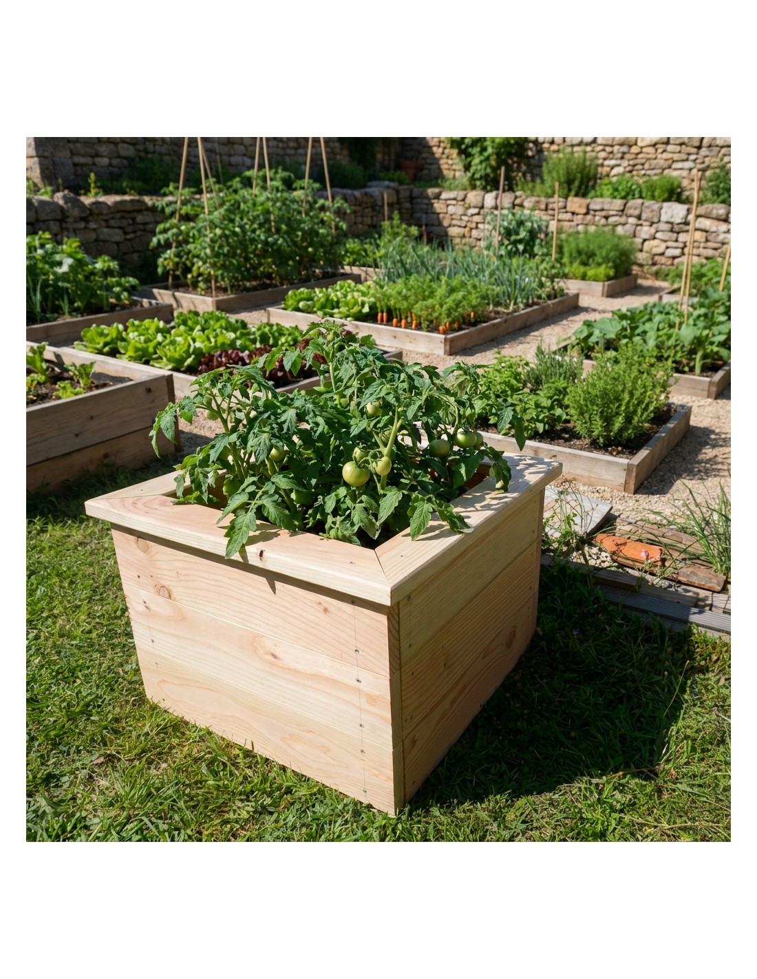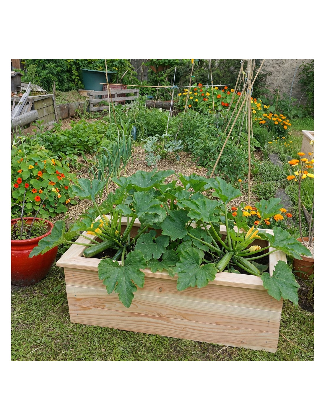 Cuadrado de huerto en kit de Douglas del Macizo Central, 3 dimensiones a elegir: 60x60, 120x60 o 120x120 cm, altura 45 cm. Tornillería de acero inoxidable incluida para un montaje duradero en exterior. Madera naturalmente resistente a las inclemencias del tiempo, sin tratamiento químico obligatorio. Montaje sencillo sobre superficie plana. Uso exterior. Madera certificada procedente de bosques gestionados de forma sostenible del Macizo Central.
