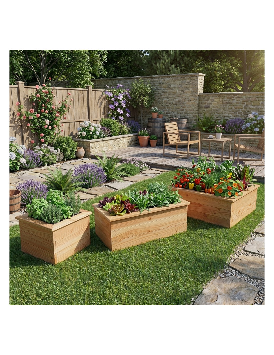 Este huerto cuadrado en kit está fabricado en madera de Douglas del Macizo Central, procedente de bosques gestionados de forma sostenible. Está disponible en tres dimensiones: 60×60 cm (pequeño), 120×60 cm (mediano) y 120×120 cm (grande), todos a una altura de 45 cm. La tornillería de acero inoxidable incluida garantiza un ensamblaje duradero en exterior sin riesgo de manchas de óxido en la madera. El Douglas es naturalmente resistente a hongos e insectos en clase de uso 3, sin tratamiento químico obligatorio.