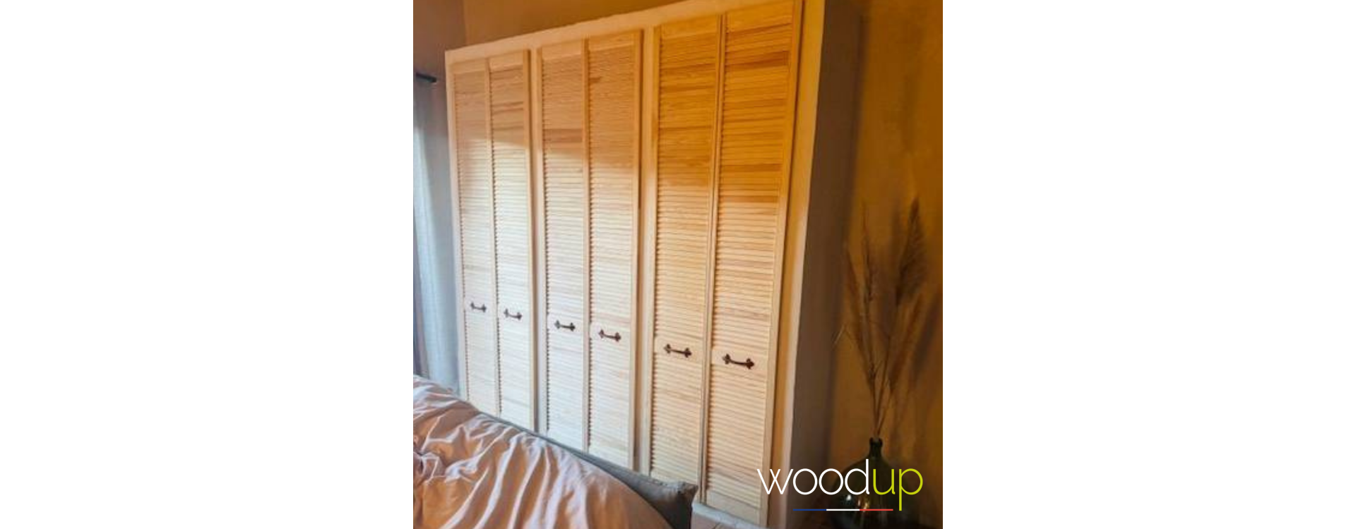Cette réalisation met en valeur un ensemble de portes de placard persiennées, parfaitement intégrées dans une chambre à l’ambiance douce et chaleureuse. Leur design persienné apporte une légèreté visuelle tout en favorisant la ventilation naturelle du rangement, idéale pour un espace nuit.