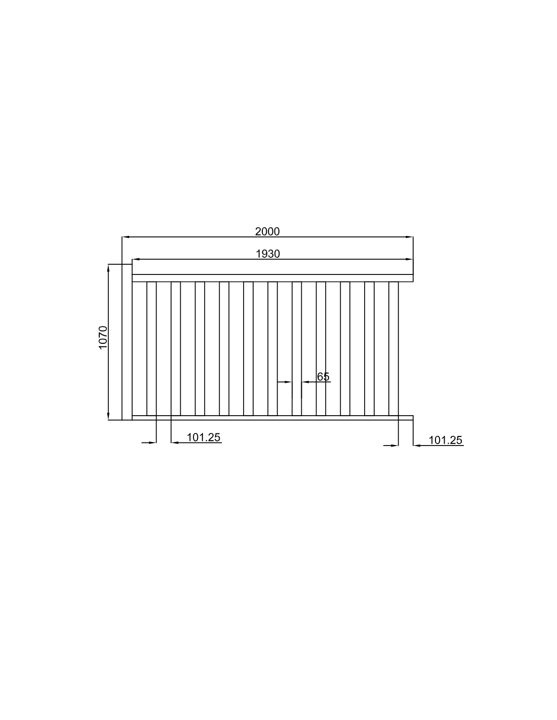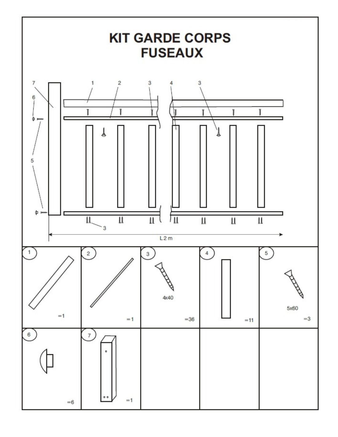 - ✓ 10 balusters 65x20mm — spacing ≤ 11 cm over 193 cm useful length