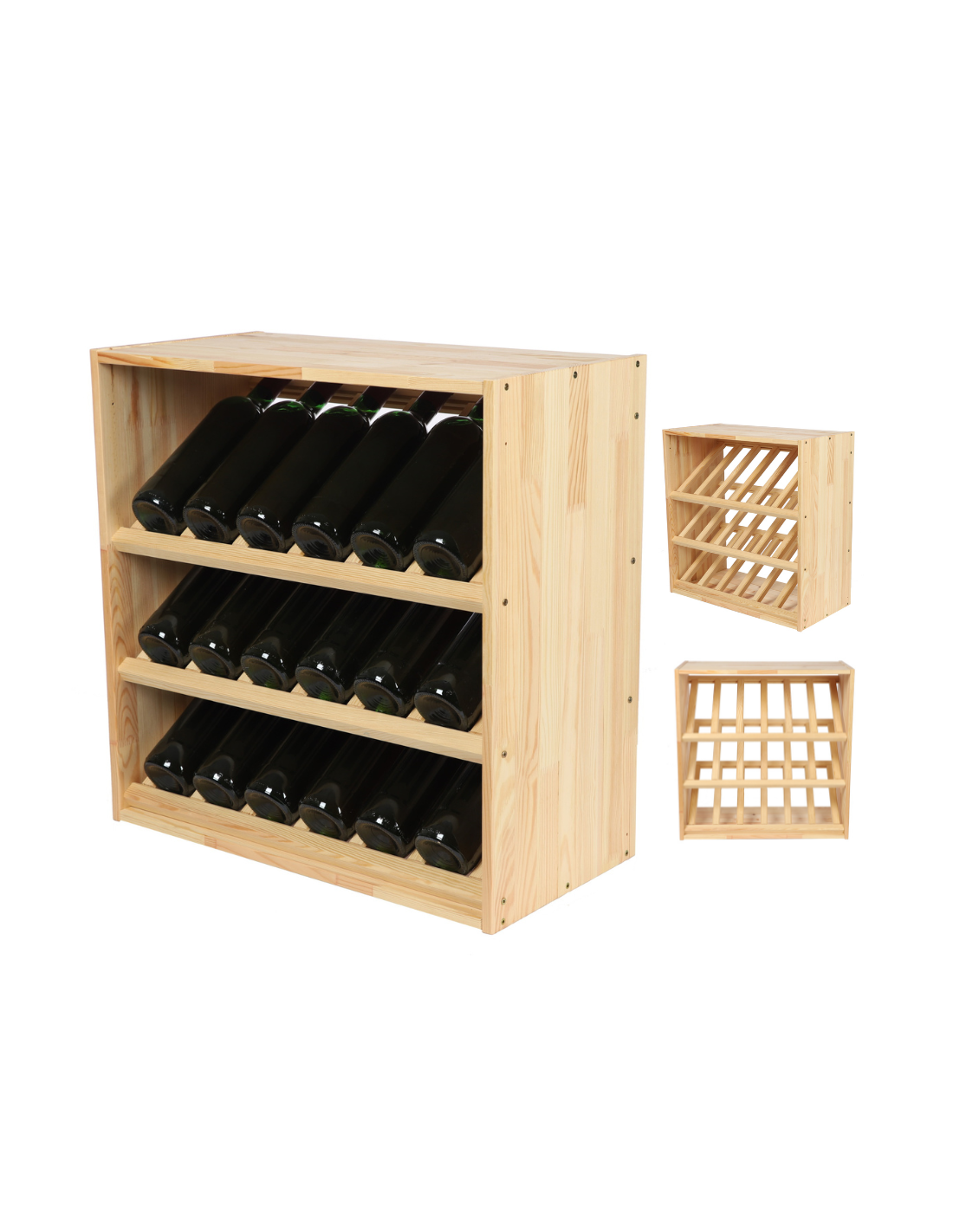 Solid pine bottle rack with 3 inclined rails for storing bottles in a stable position. Assembled dimensions: 60 × 60 × 30 cm. Indoor use.