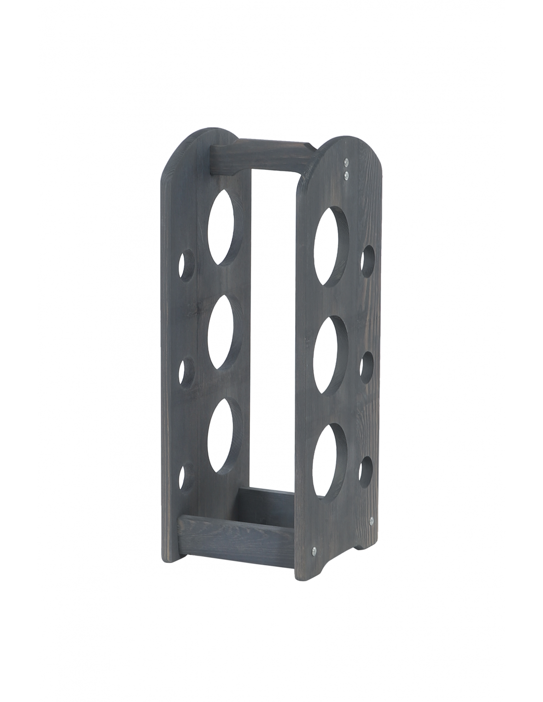 The lateral circular cut-outs ensure stable bottle support. The integrated handle at the top allows easy moving for indoor use in the kitchen, living room or cellar.