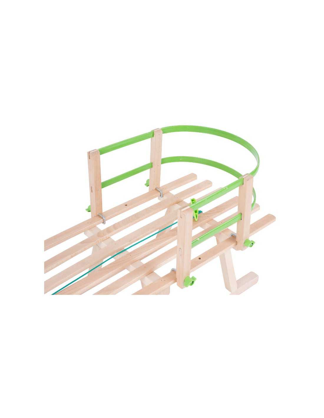 Beech wood sledge with folding backrest, maximum load 70 kg. Metal reinforced front runners. Backrest secured by 4 wing nuts for quick and easy removal. Naturally dense and impact-resistant beech. Suitable for children and adults up to 70 kg. Delivery within 10 days. Snow use only. Beech is a dense wood species (0.72 kg/dm³) offering good resistance to sledging impacts.