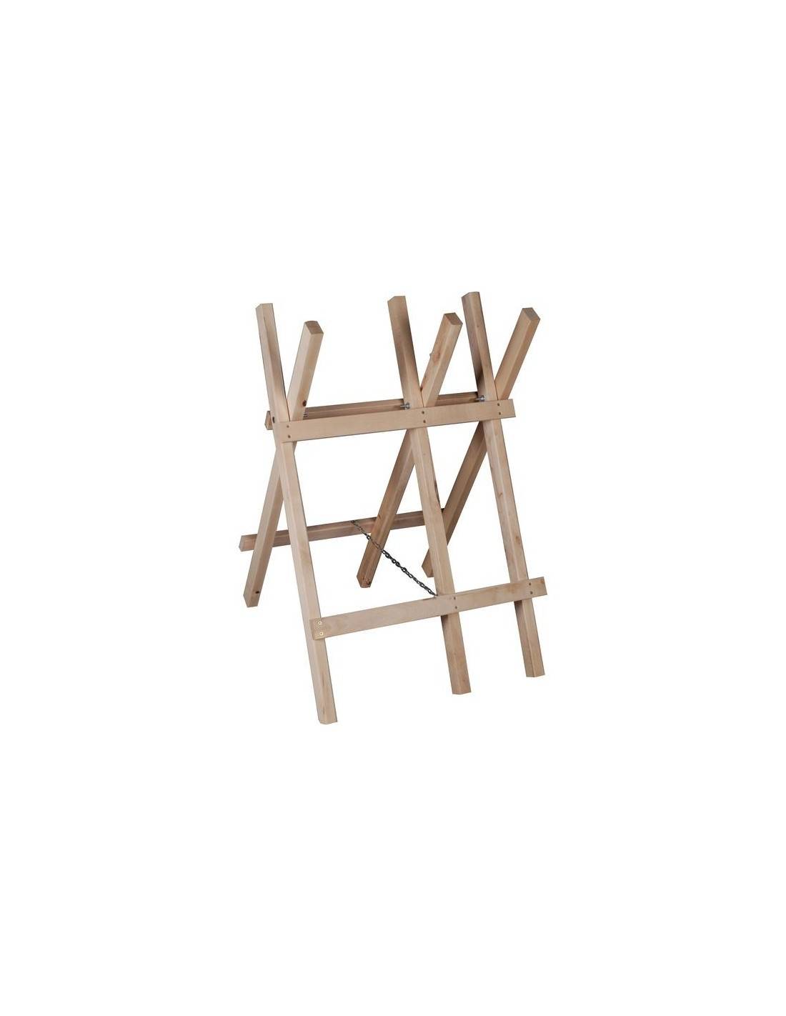 Store the sawhorse under shelter when not in use to extend the life of the wood. Check the condition of the safety chain annually — replace it if the links show deformation or excessive wear. Tighten the joints if play appears after several seasons.