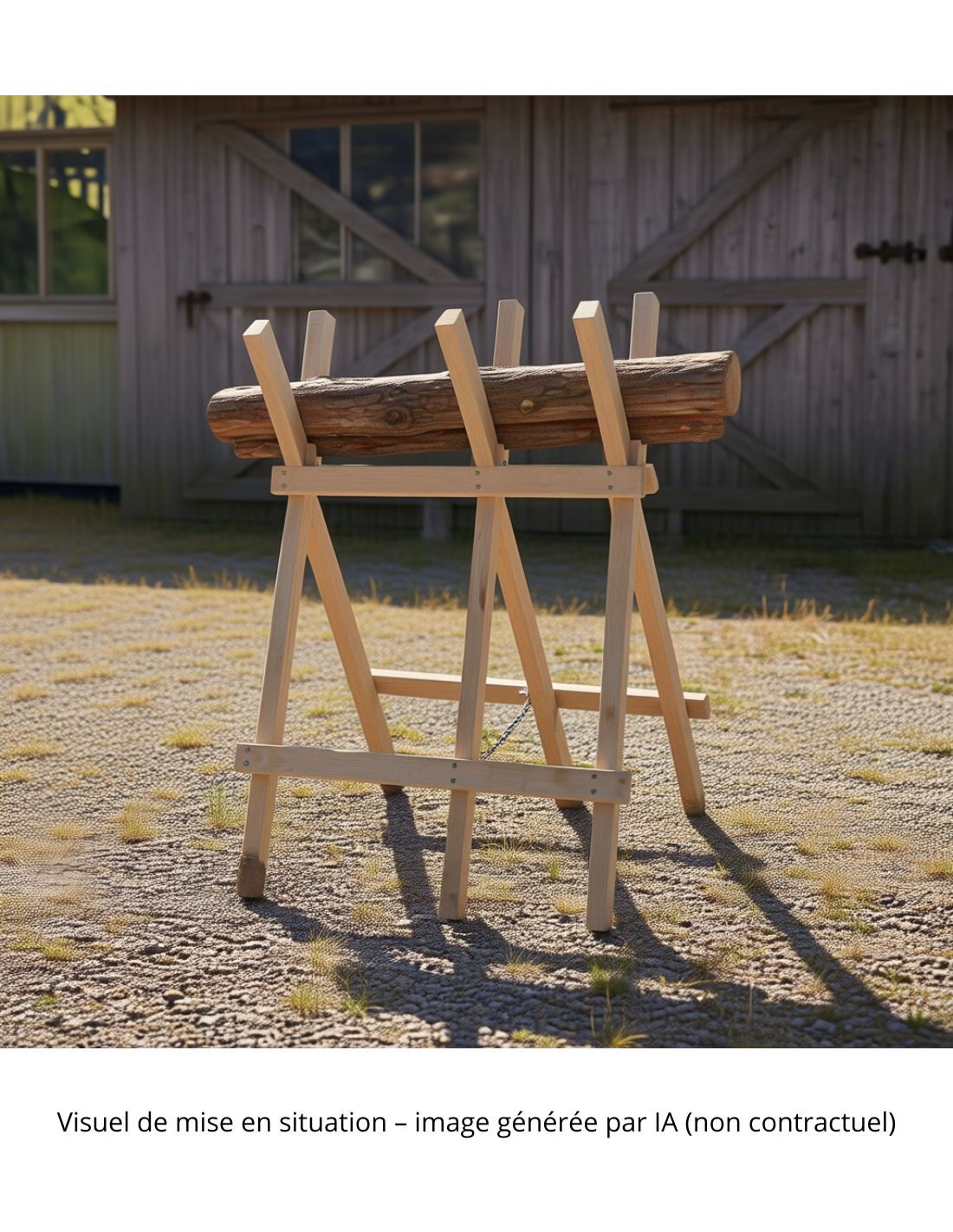Place the sawhorse on a flat, stable surface. A slightly rough surface (gravel, brushed concrete) limits slipping during sawing. Place the logs in the V of the uprights and secure with the chain before starting to saw. Keep the holding hand at a safe distance from the blade. For a chainsaw, wear all mandatory personal protective equipment.