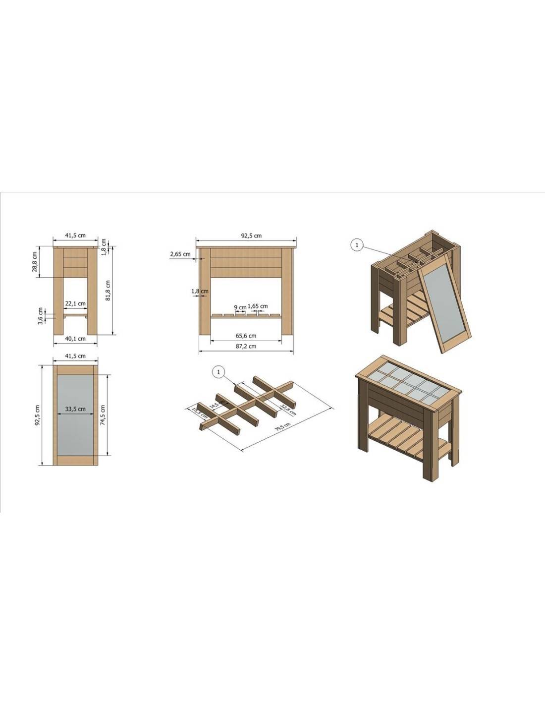 Raised treated pine bed, dimensions 92x82xH 82 cm, 8 distinct growing compartments to organise your plantings. Integrated laminated wood panel acting as a mini greenhouse to protect seedlings from climatic variations. Lower shelf for storing gardening tools and accessories. Supplied as a kit with fixings. Ideal for elevated urban gardening on a terrace or balcony.