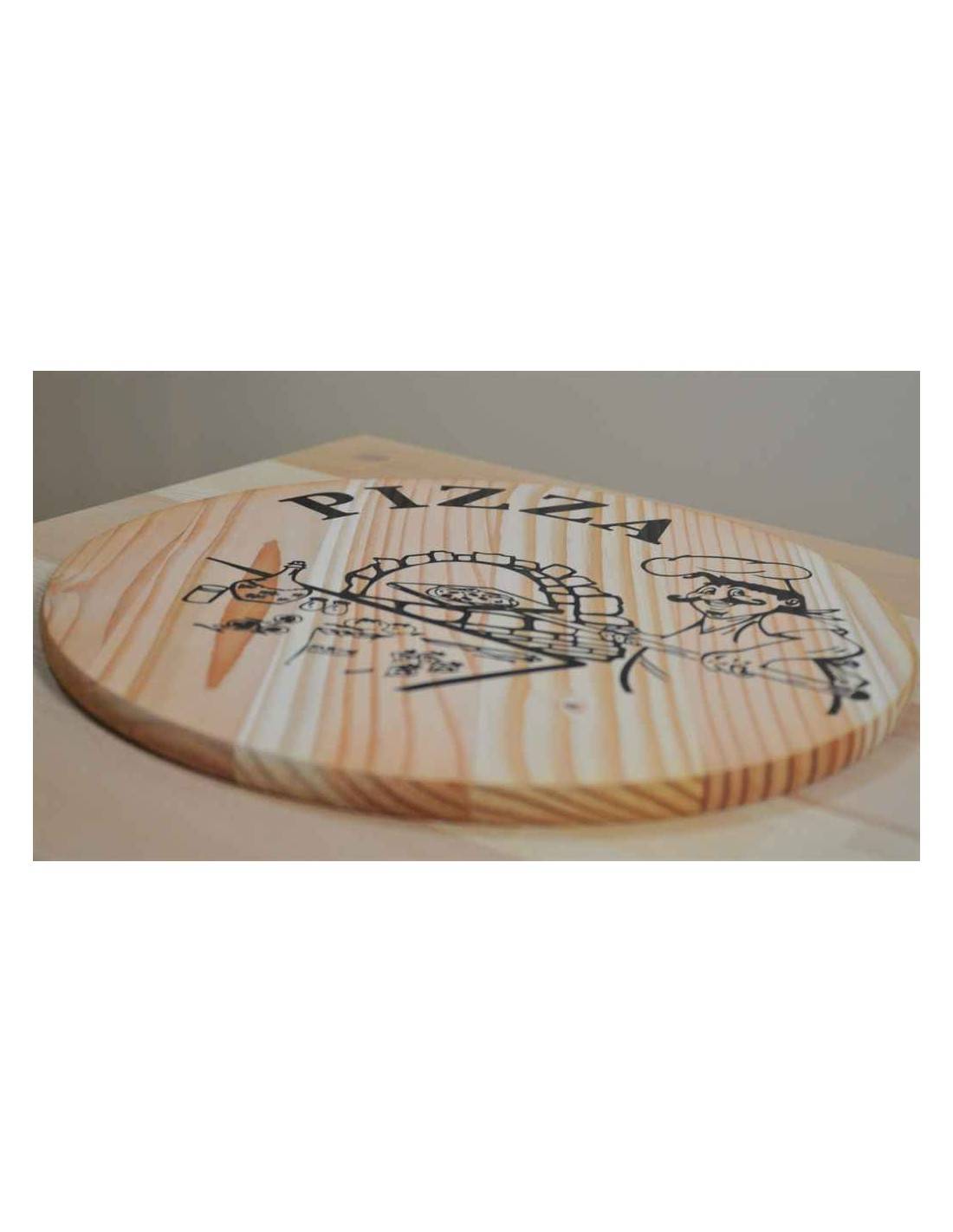 Untreated natural fir pizza board — diameter 33 cm. Pizza serving and presentation directly at the table. Lightweight wood, food contact with no risk. Easy to maintain. Kitchen and serving use.