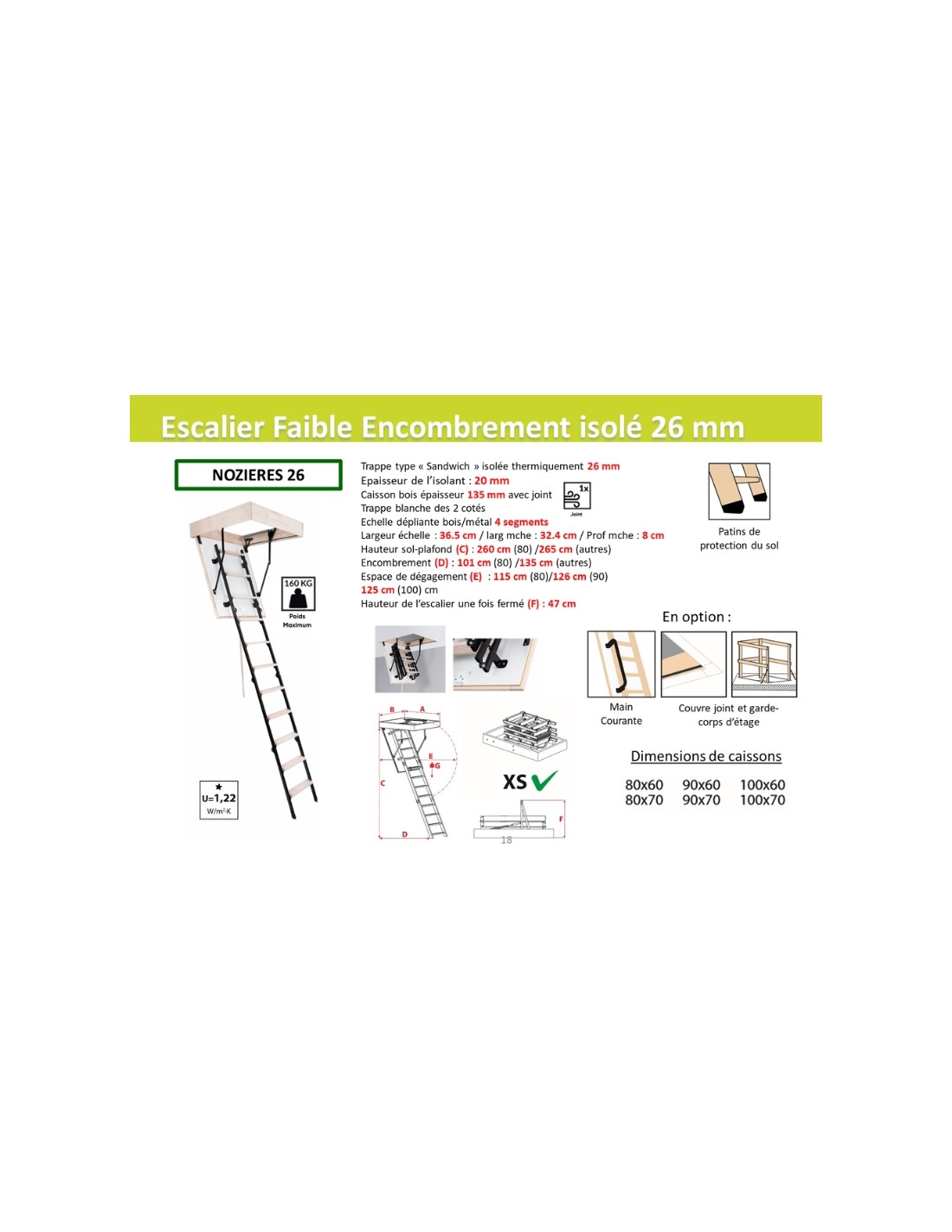 NOZIERES 26 mm loft ladder designed for a low footprint and optimal insulation. Ideal for small stairwell openings, it accommodates ceiling heights up to 265 cm thanks to its 26 mm insulated hatch. Robust metal structure with wooden treads, supplied with protective pads.