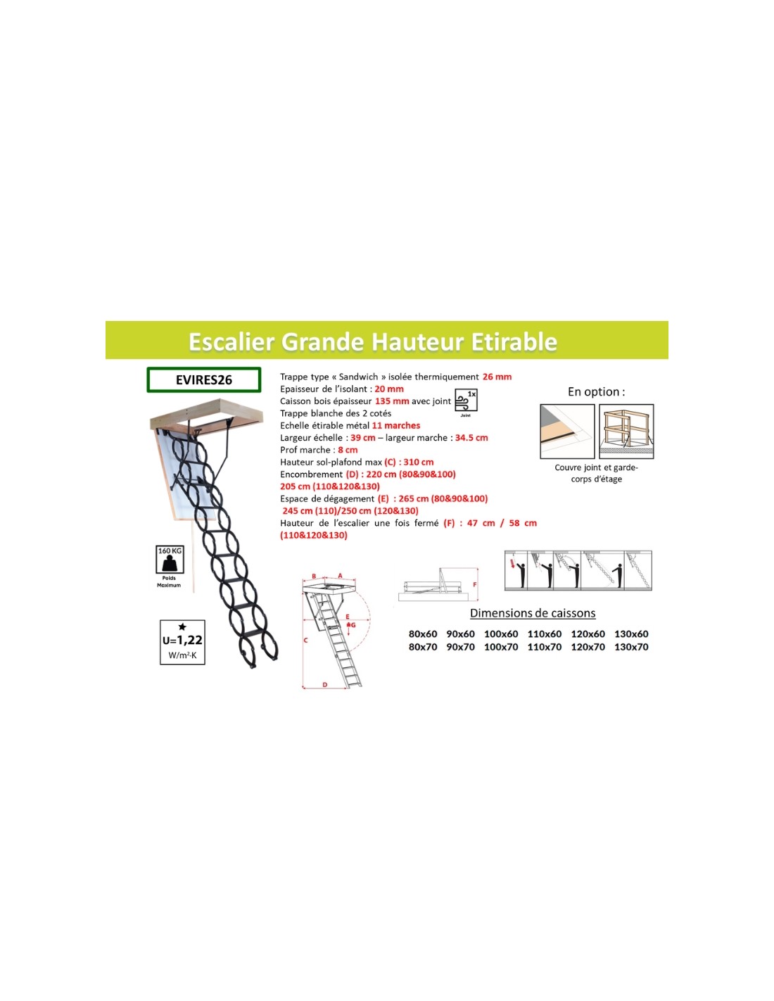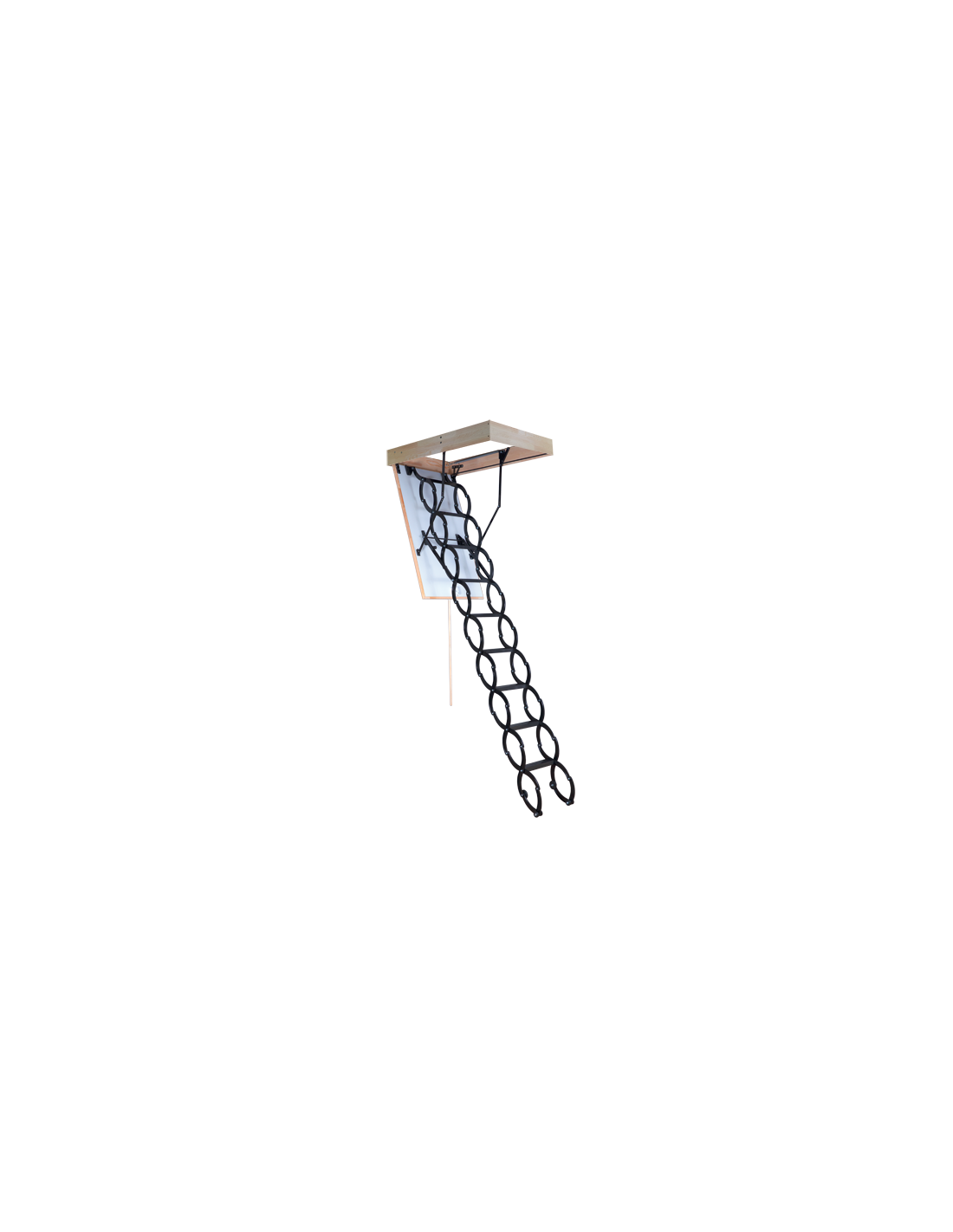 This extendable loft ladder model with a robust wooden box and a metal accordion ladder is designed to reach a floor-to-ceiling height of up to 310 cm. The 26 mm thick insulated hatch ensures quality thermal insulation with a U coefficient = 1.22 W/m².K. Suited to compact stairwell openings, this ladder combines solidity and functionality.