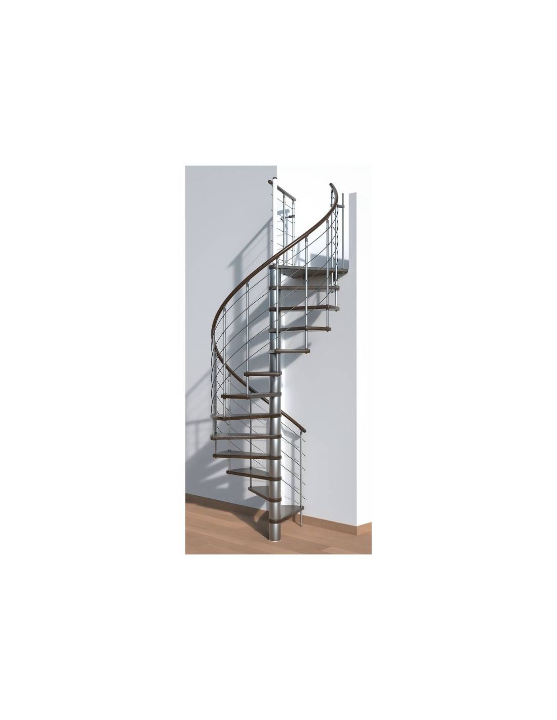 ARLBERG walnut stain is a spiral staircase designed for indoor use when the available space requires a reduced floor footprint. Its spiral configuration connects two levels in a compact manner, whether in renovation or new construction, subject to compatibility with the stairwell opening and floor-to-floor height. The glued laminated beech treads provide a stable structure and assembly suited to kit installation.
