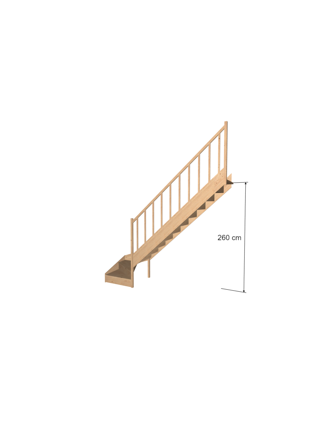 Made from solid fir and delivered unfinished, this staircase is intended to receive a protective finish after installation. It is available with or without risers, depending on whether you want a closed or open-riser staircase. The structure is built on workshop-machined stringers, enabling stable fitting of the treads and progressive assembly in accordance with the supplied instructions.
