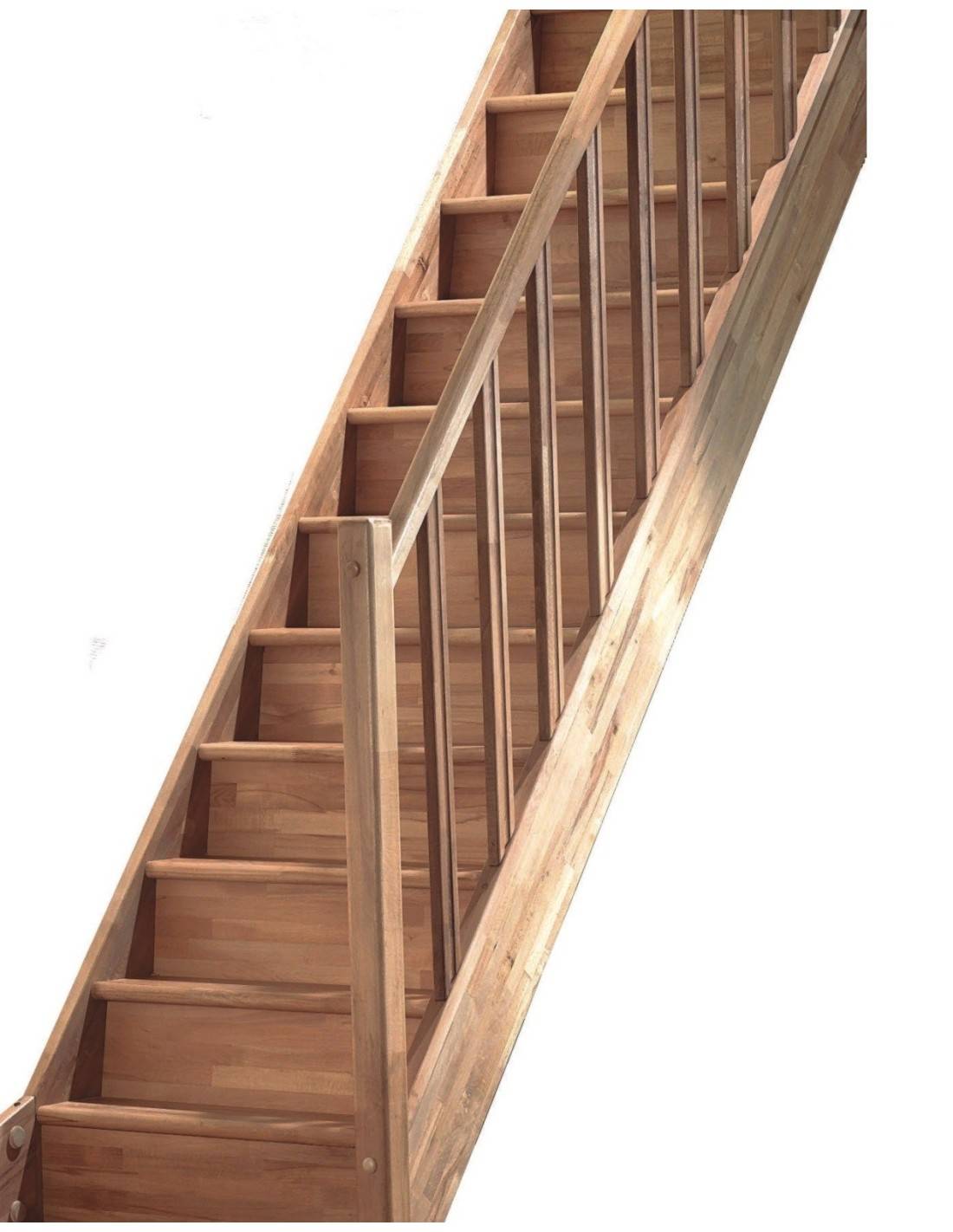 Straight staircase in glulam oak14 steps, width 80 cm, footprint 259 cm, section 210×30 mm. Sold without handrail. Available with or without risers. Standard range. Bare wood ready to finish.