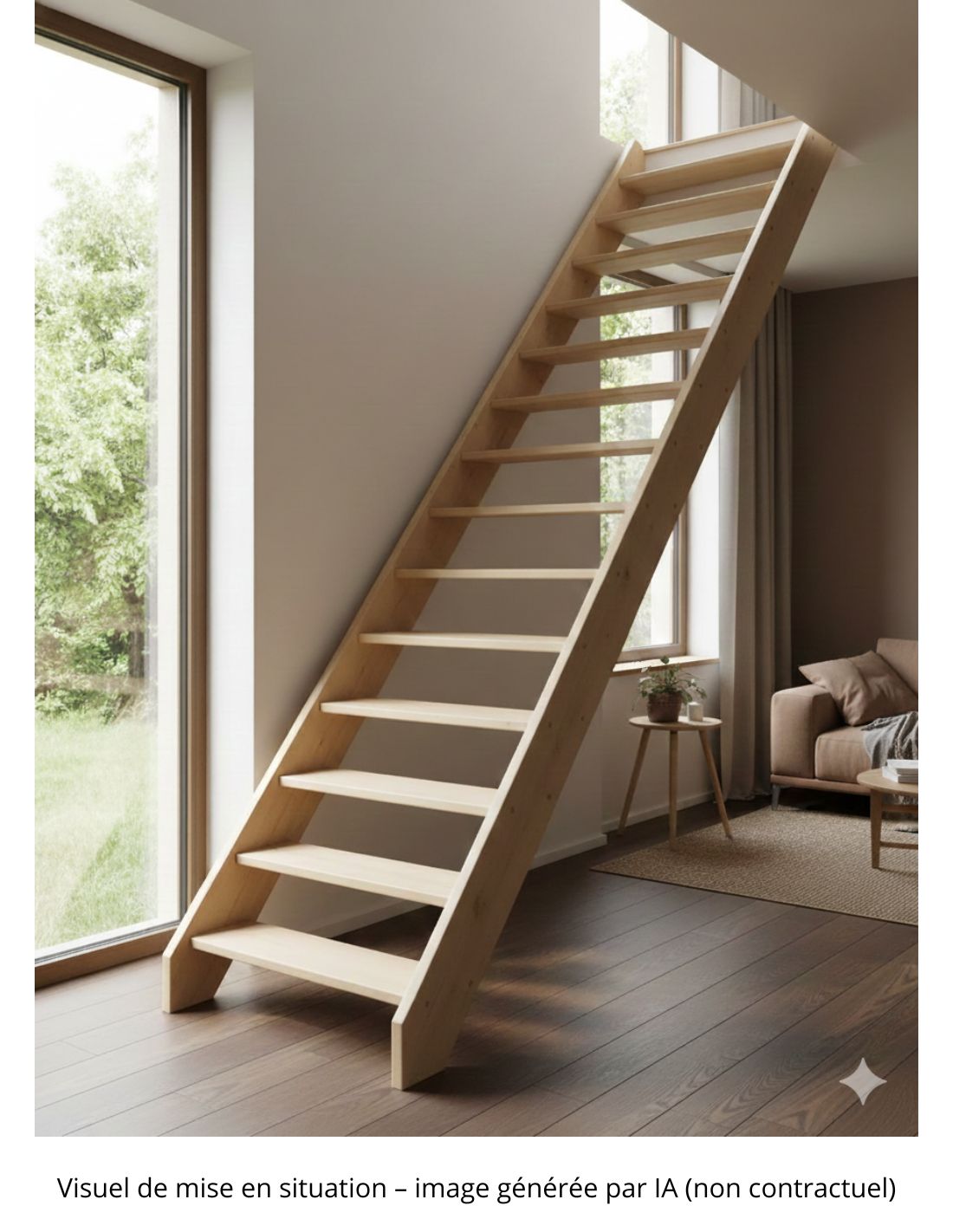 The Fageole staircase is a practical and robust solution for accessing a floor, a mezzanine, or a loft. Made from solid wood and delivered as a kit, it adapts to several configurations thanks to its trimmable stringers and different widths. Available in fir, beech, or oak, it offers an excellent compromise between functionality and natural aesthetics.