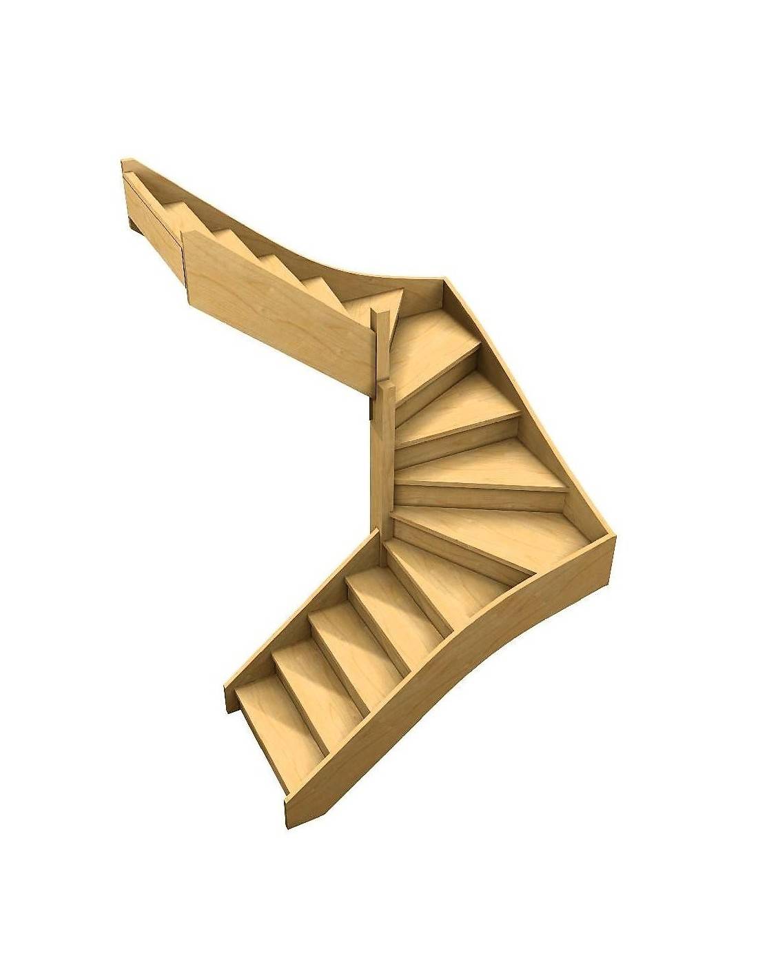 Double quarter-turn wooden staircase right or left, delivered with a wooden spindle balustrade.