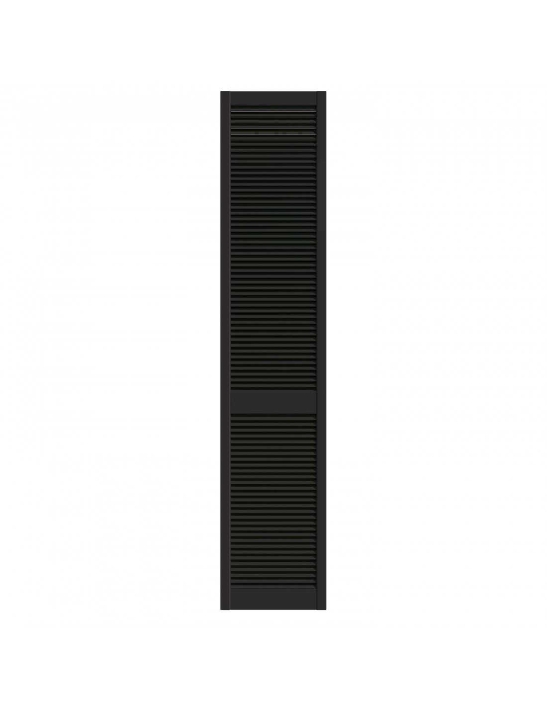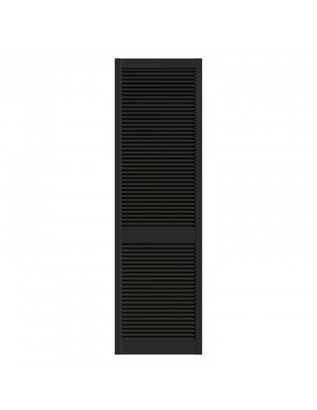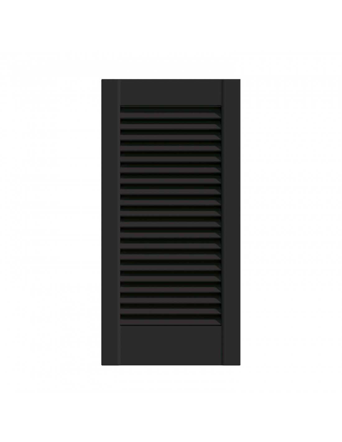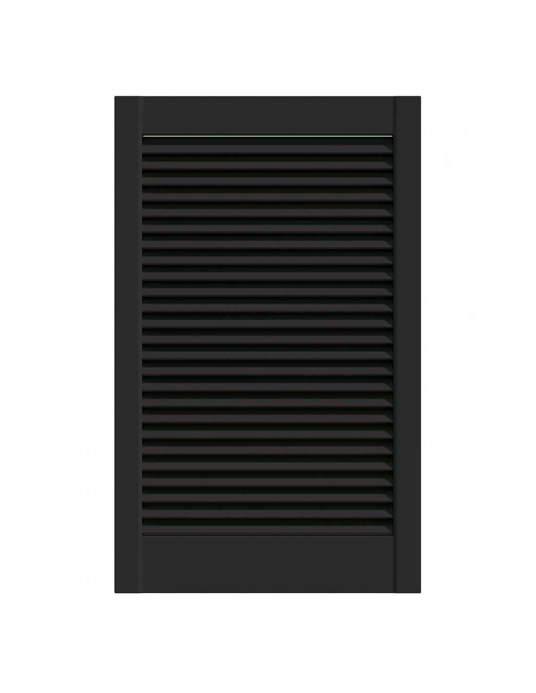 Black lacquered pine louvred wardrobe door panel, 4 available dimensions: 201.3×39.4 / 201.3×49.4 / 201.3×59.4 / 242.2×49.4 cm. Satin black lacquered finish, ready to install. Louvred slats for natural ventilation. Sold without rail, without hinges and without handles — hardware to be ordered separately depending on the chosen system. Cannot be cut to size. Indoor use only.
