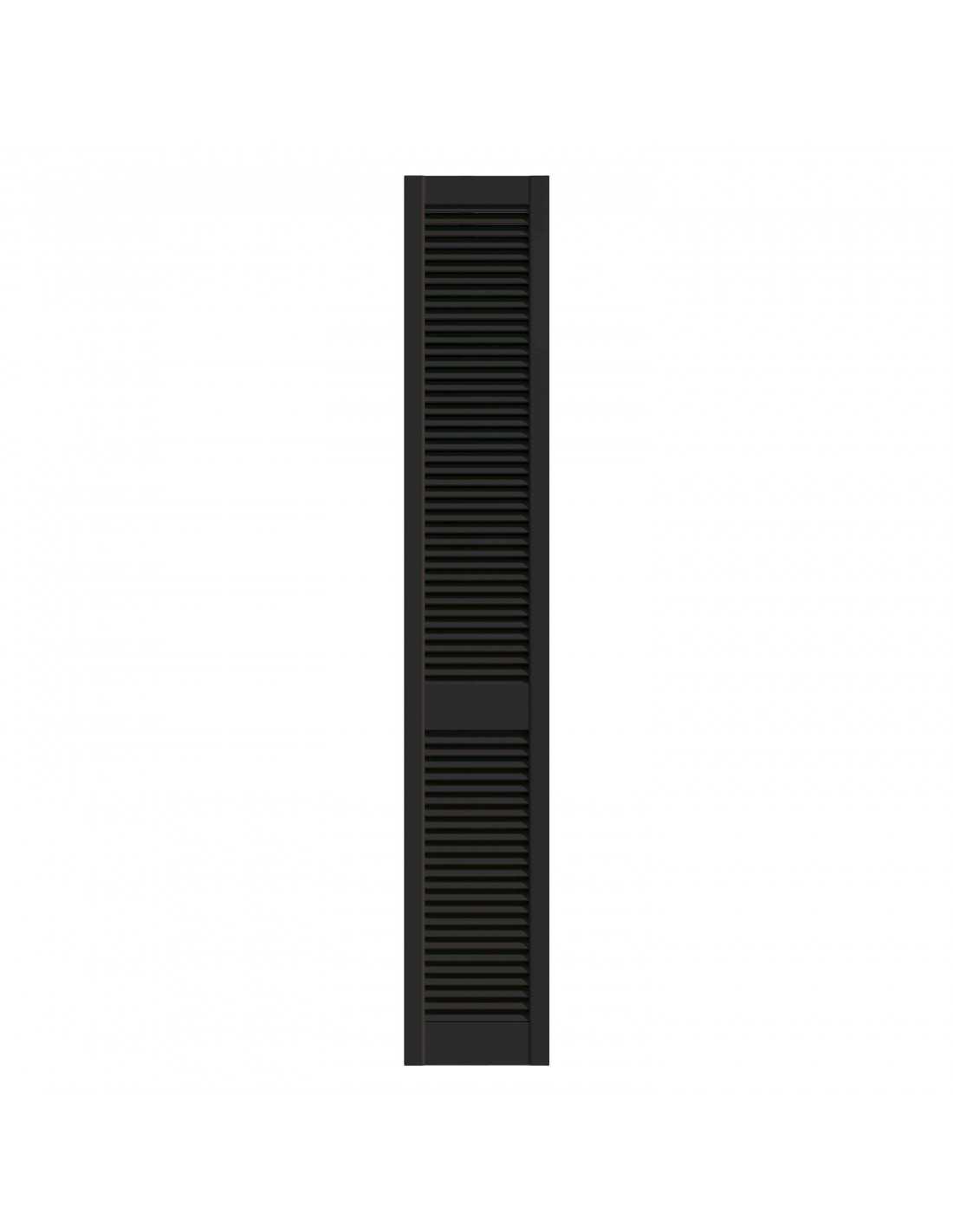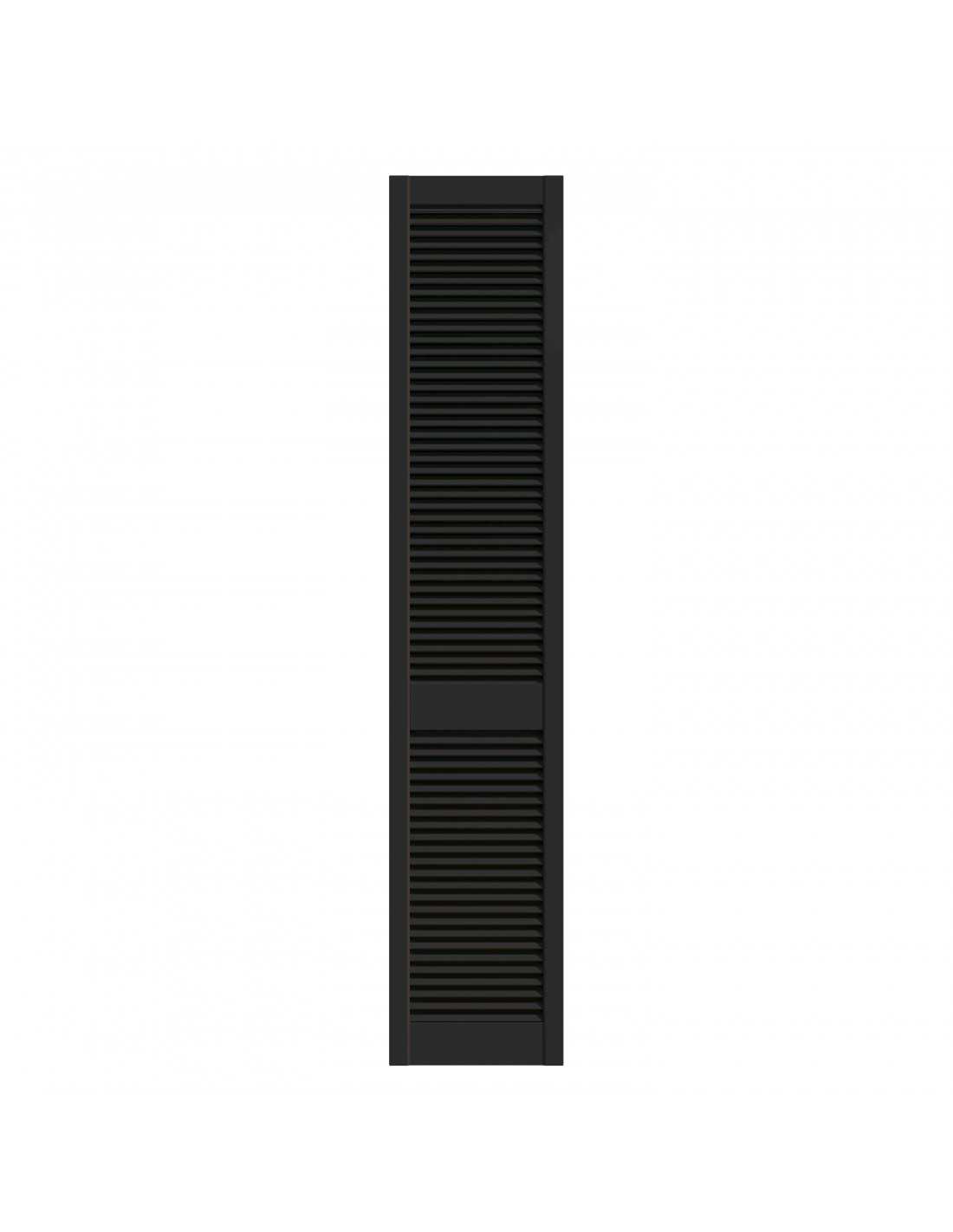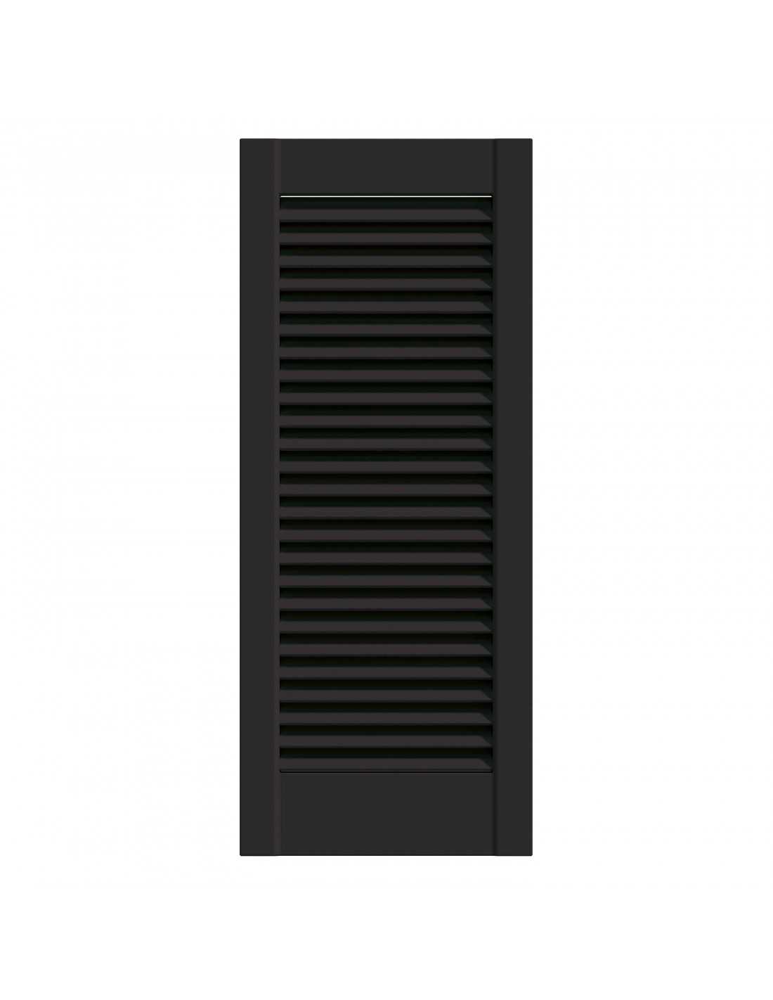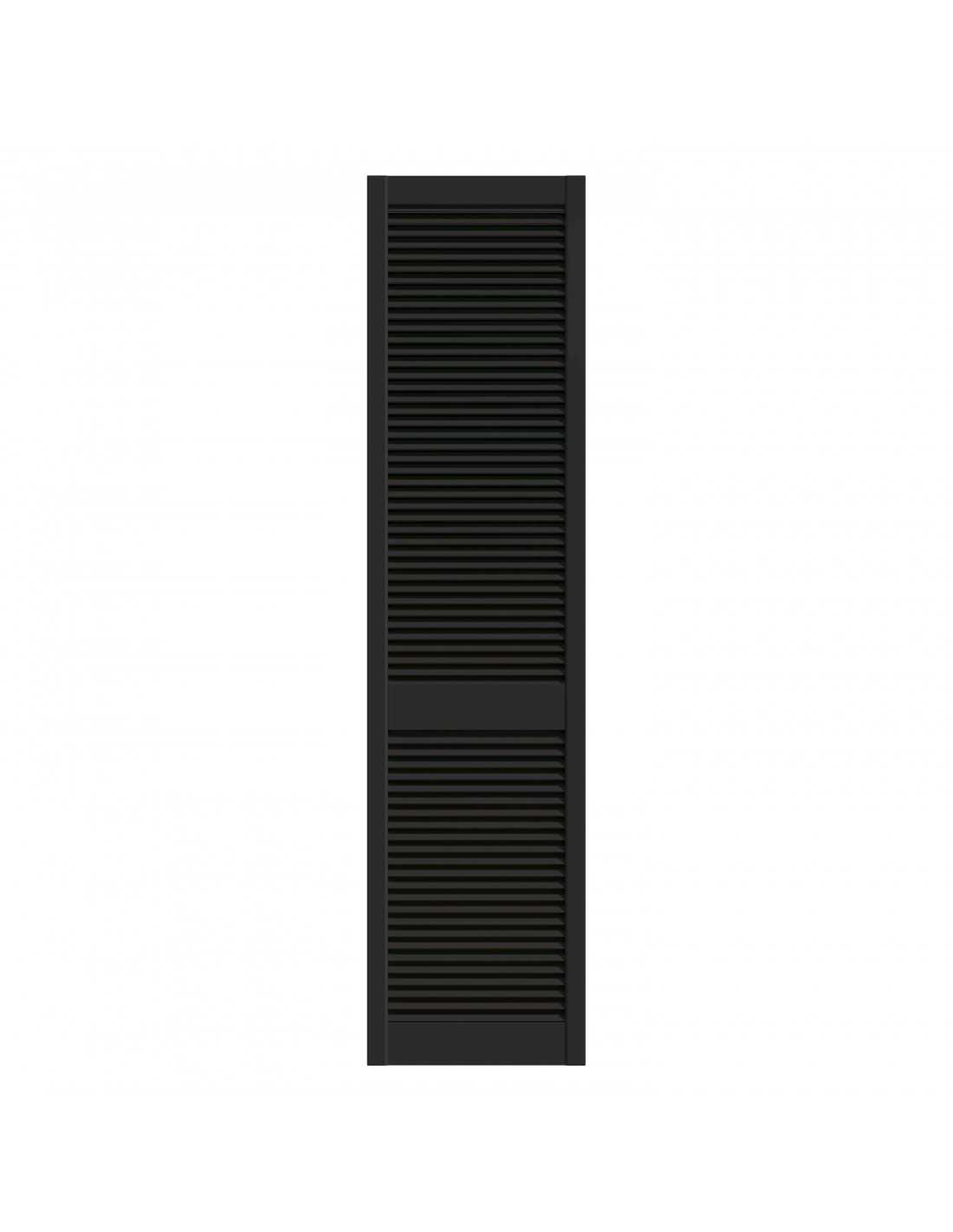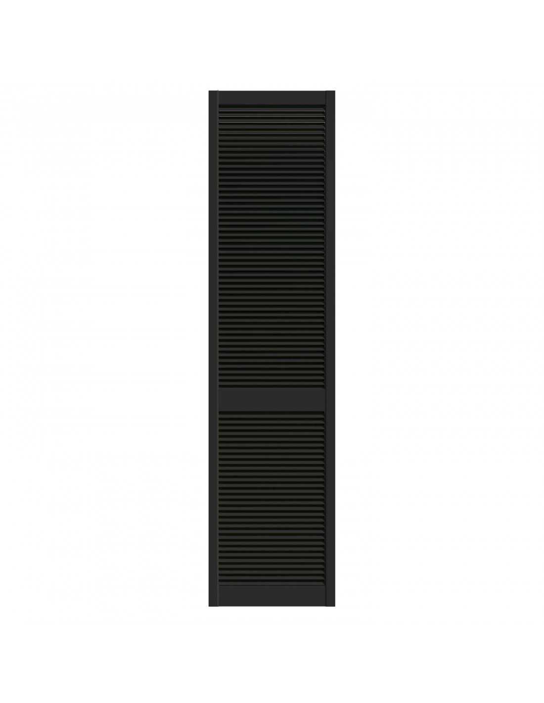 Black lacquered pine louvred wardrobe door panel, 4 available dimensions: 201.3×39.4 / 201.3×49.4 / 201.3×59.4 / 242.2×49.4 cm. Satin black lacquered finish, ready to install. Louvred slats for natural ventilation. Sold without rail, without hinges and without handles — hardware to be ordered separately depending on the chosen system. Cannot be cut to size. Indoor use only.