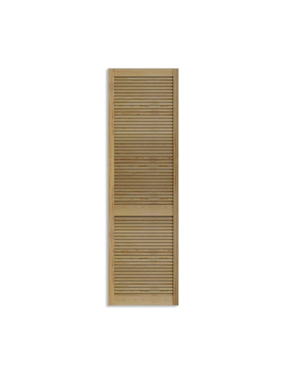 Natural pine louvred wardrobe door panel, 28 mm thickness for enhanced rigidity, 7 sizes from 201.3×39.4 cm to 242.2×59.4 cm. Open louvres for natural ventilation — ideal for large wardrobe and pantry openings. Compatible with sliding track or hinges. Delivered raw without hardware, to be painted or varnished. Cannot be cut down. Sold individually. For indoor use only.