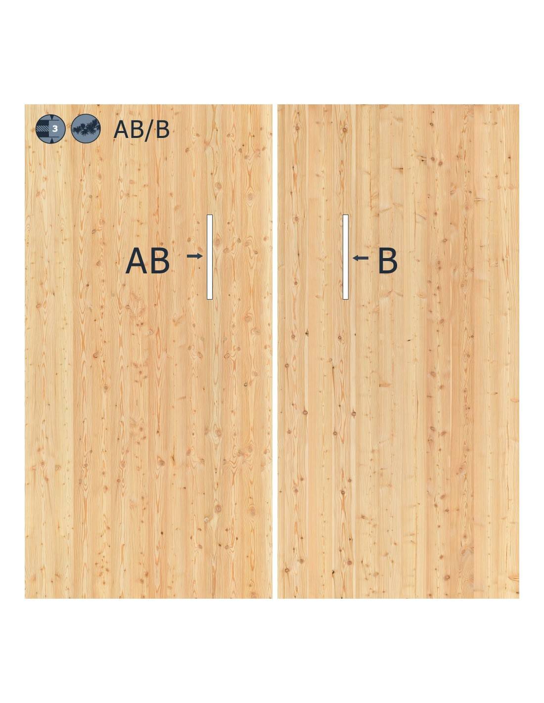 AB: Homogeneous surface with closed joints, discreet growth rings, sound knots and resin pockets tolerated, overall harmonious appearance.