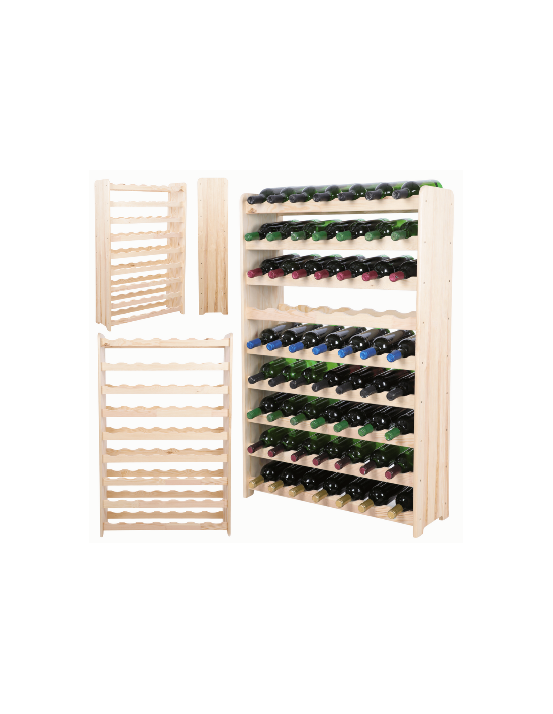 Questo portabottiglie in legno naturale offre una capacità di 63 bottiglie con un design compatto ed elegante. Il montaggio è semplice e rapido, richiedendo solo un cacciavite. Ideale per una conservazione ottimale del vino, trova facilmente il suo posto in una cucina, una cantina o uno spazio di stoccaggio.