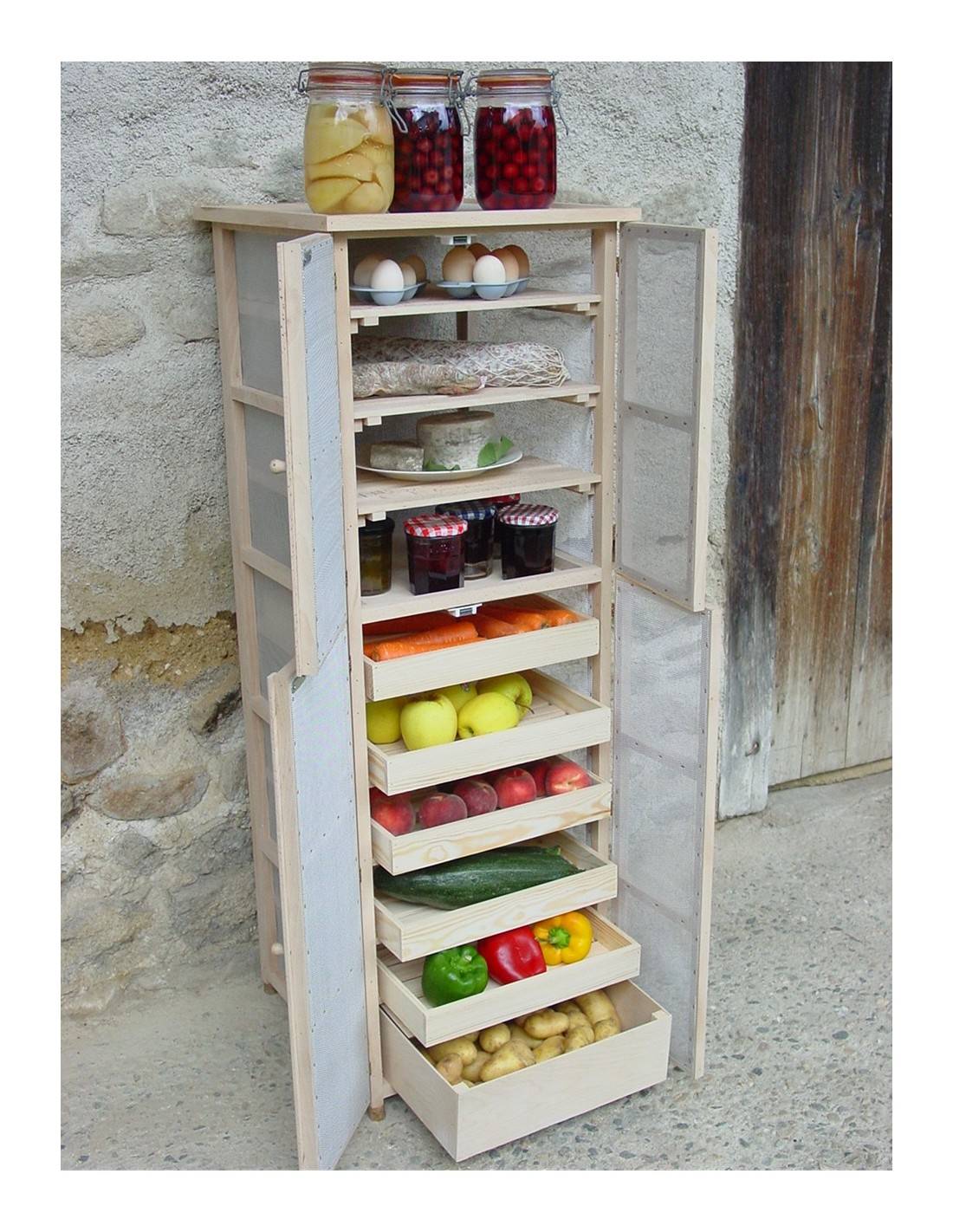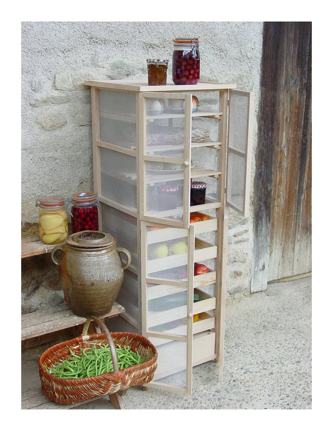 Il nostro portafrutta-portaverdura in legno di faggio è ideale per conservare frutta, verdura, formaggi e carni essiccate. Con un'altezza di 119 cm, comprende una porta con griglia anti-insetti, 4 ripiani amovibili e 6 cassetti a scorrimento per un'organizzazione ottimale.