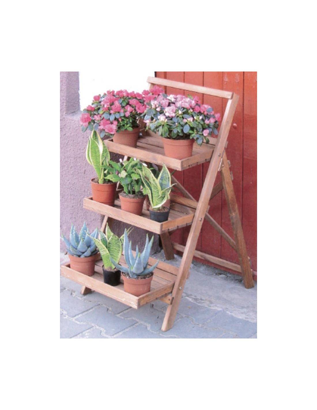 Questa scaffalatura per piante in pino tinto naturale propone 3 livelli con una struttura pieghevole senza attrezzi. Le sue dimensioni sono H 93 cm, L 45 cm, P 52 cm. La concezione pieghevole permette un facile riposto in piano a fine stagione. Utilizzabile in interno e in esterno. La profondità di 52 cm accoglie vasi fino a 50 cm di diametro su ogni livello.
