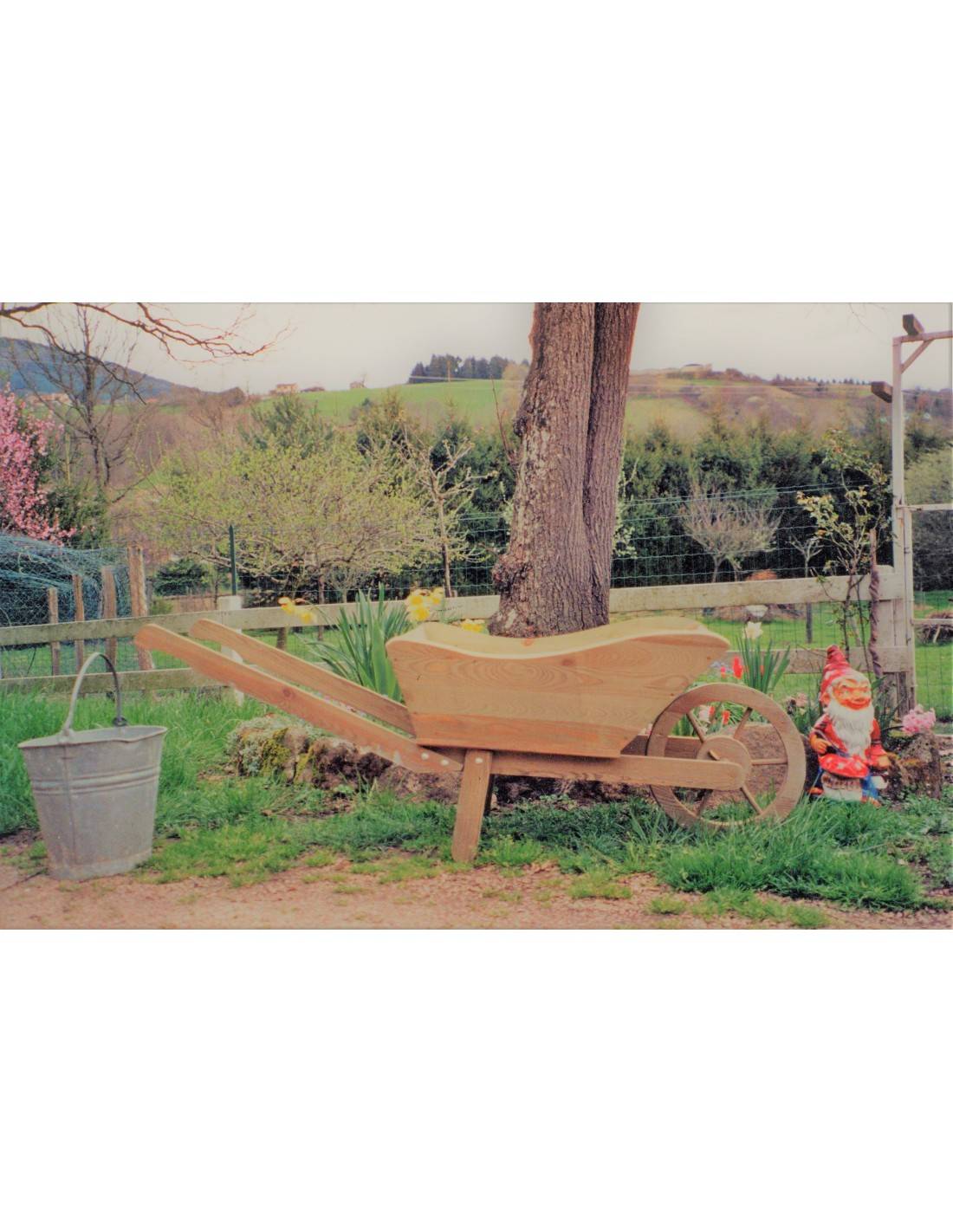 Carriola decorativa in pino trattato, lunghezza 143 cm, larghezza 56 cm, altezza 48 cm. Fioriera originale per composizioni floreali da esterno. Pino trattato resistente alle condizioni esterne. Grande capacità per accogliere un bouquet di piante o fiori vari. Posizionare in una zona visibile del giardino, al riparo dai venti. Manutenzione: olio per legno da esterno annualmente. Aggiungere un film plastico sul fondo prima del riempimento di terra per prolungare la durata del legno.