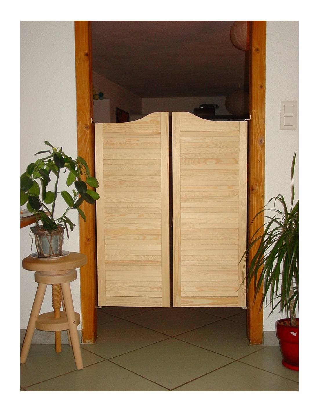 Porte western a persiana in pino naturale grezzo, 2 ante, spessore 21 mm. Larghezze 68 cm (2×34 cm) per apertura 73 cm, o 78 cm (2×39 cm) per apertura 83 cm. Altezza a cappello di gendarme: 99 cm lati, 104 cm centro. Lamelle persiana per separazione arieggiata e luce filtrata. Perni non inclusi — venduti separatamente Perni va-e-vieni o in kit Kit porta western pino + perni. Finitura grezza da trattare. Solo per uso interno.