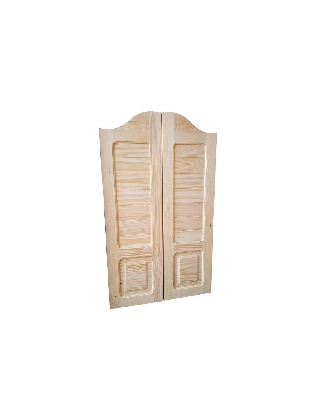 Porte western a pannelli pieni in pino naturale 30 mm, vendute in lotto di 2 ante. Profilo a cappello di gendarme: 105 cm sui lati, 115 cm al centro. Larghezze 68 cm (apertura consigliata 73 cm) o 78 cm (apertura 83 cm). Vendute senza perni né cerniere — da abbinare al kit perni Perni va-e-vieni o cerniere a doppia azione Cerniera a doppia azione H75. Finitura pino naturale grezzo. Solo per uso interno.