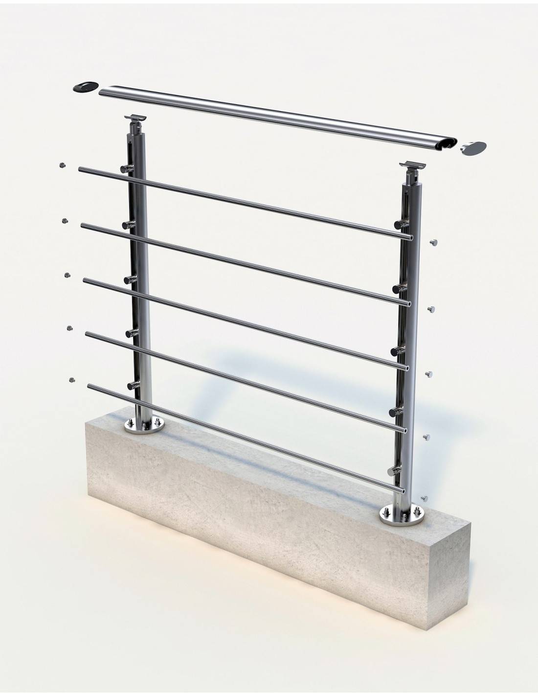 Kit di partenza Ellipsis in alluminio anodizzato, ideale per interni ed esterni. Disponibile in nero lucido e inox lucido. Include 2 pali, 1 corrimano, 5 correnti tondi, terminali di finitura. Viti di fissaggio al suolo non incluse.