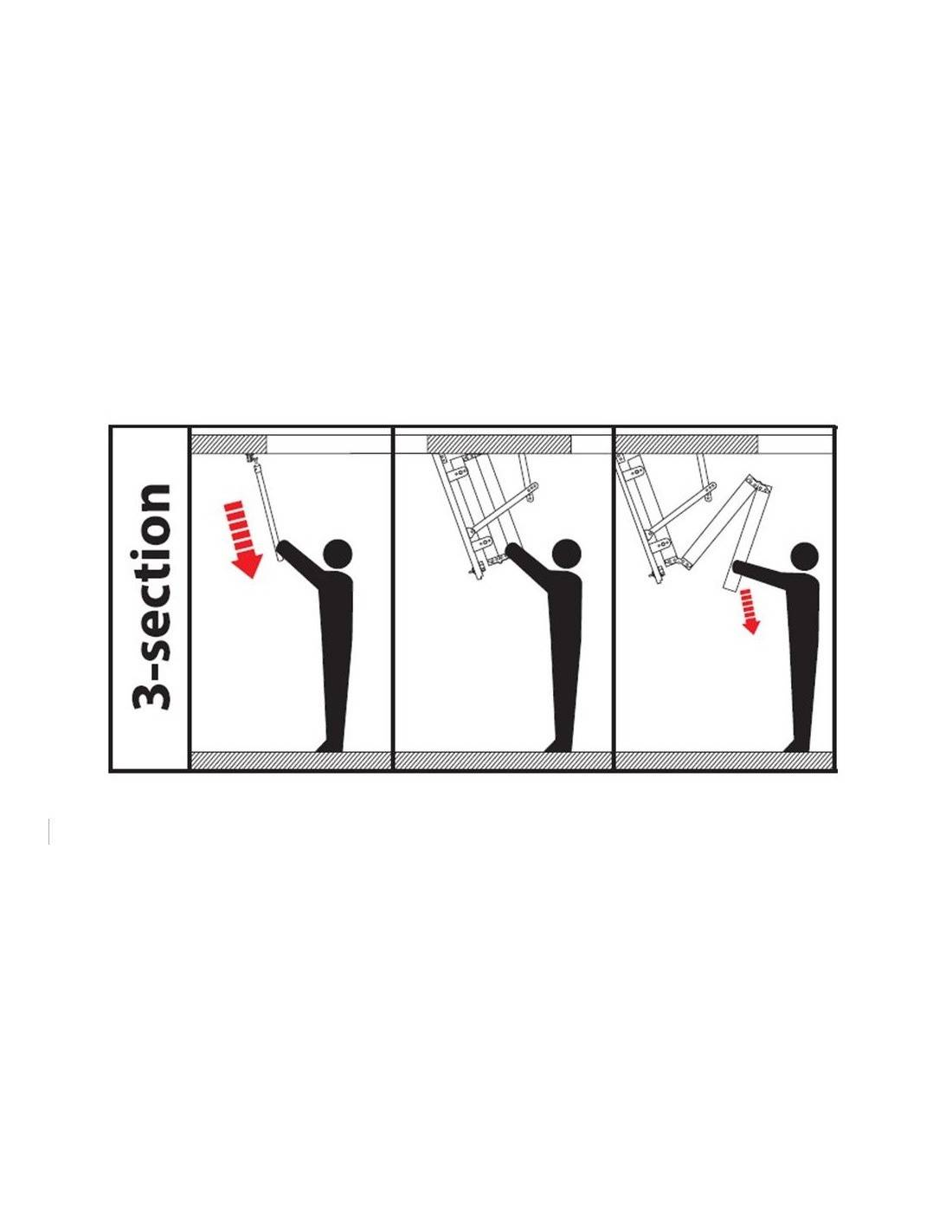 Questa scala retrattile è ritagliabile in base all'altezza desiderata, con un'altezza da pavimento a soffitto di 2m80. La botola marrone è da 26 mm e garantisce un isolamento termico di prima necessità. Comprende 3 segmenti e 12 gradini per un comodo accesso al sottotetto.