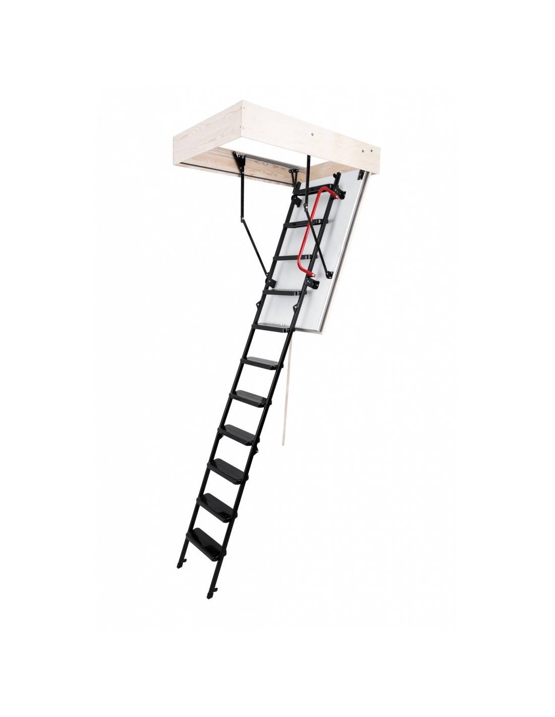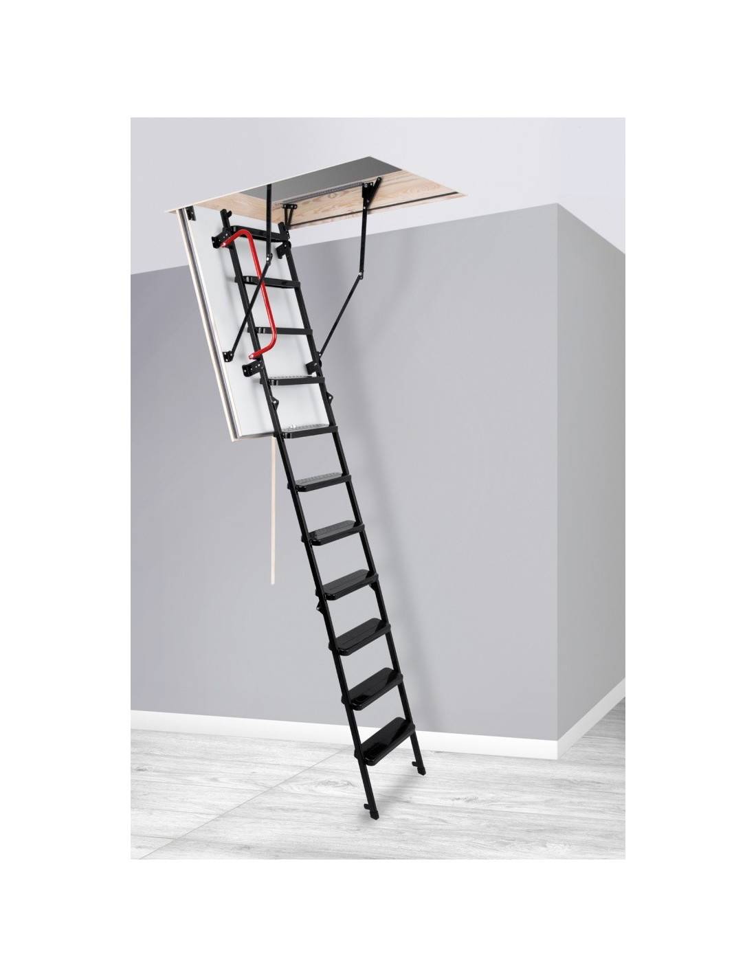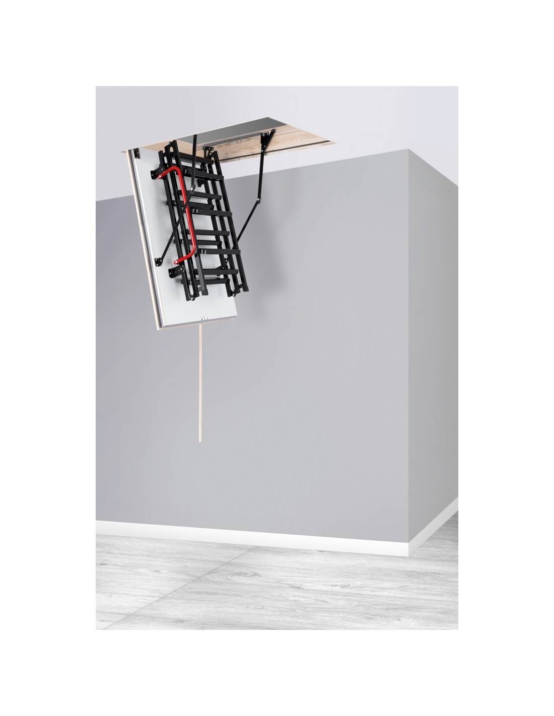 Scala a scomparsa tagliafuoco EI60 con scala in metallo e botola in legno. Isolamento termico ottimale (U = 0,54 W/m².K) e fornita con corrimano e pattini di protezione.