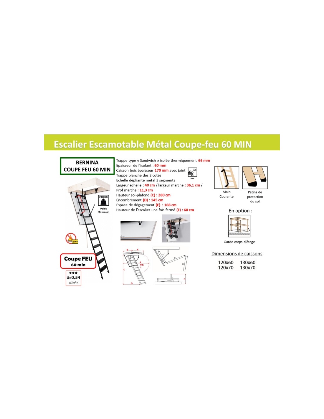 Con la sua costruzione in scala in metallo e botola in legno isolata da 66 mm, questa scala è ideale per edifici residenziali o professionali che richiedono un'elevata resistenza al fuoco.
