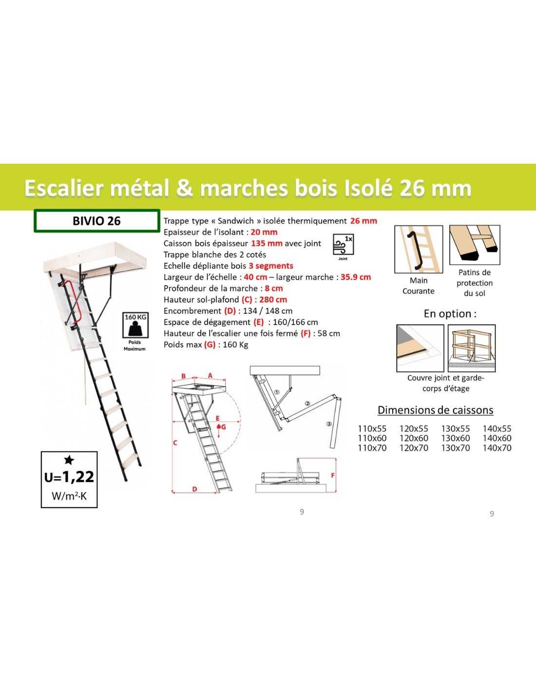 Grazie al suo isolamento termico performante (U = 1,22 W/m².K), questa scala limita le dispersioni di calore, rendendola un'ottima scelta per le abitazioni che desiderano ottimizzare la propria efficienza energetica. Adatta ad altezze fino a 2,80 m, è disponibile in numerose dimensioni per adattarsi al vostro spazio.