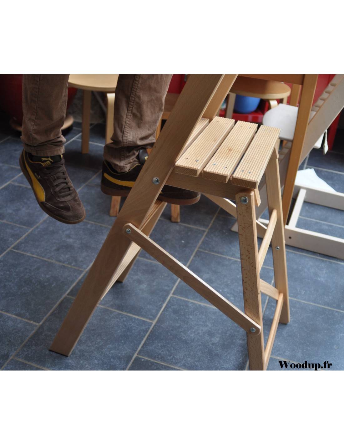Scoprite la scaletta pieghevole a 2 gradini con barra di appoggio e piattaforma in pino naturale, che unisce sicurezza, design compatto e versatilità per tutte le vostre attività domestiche.