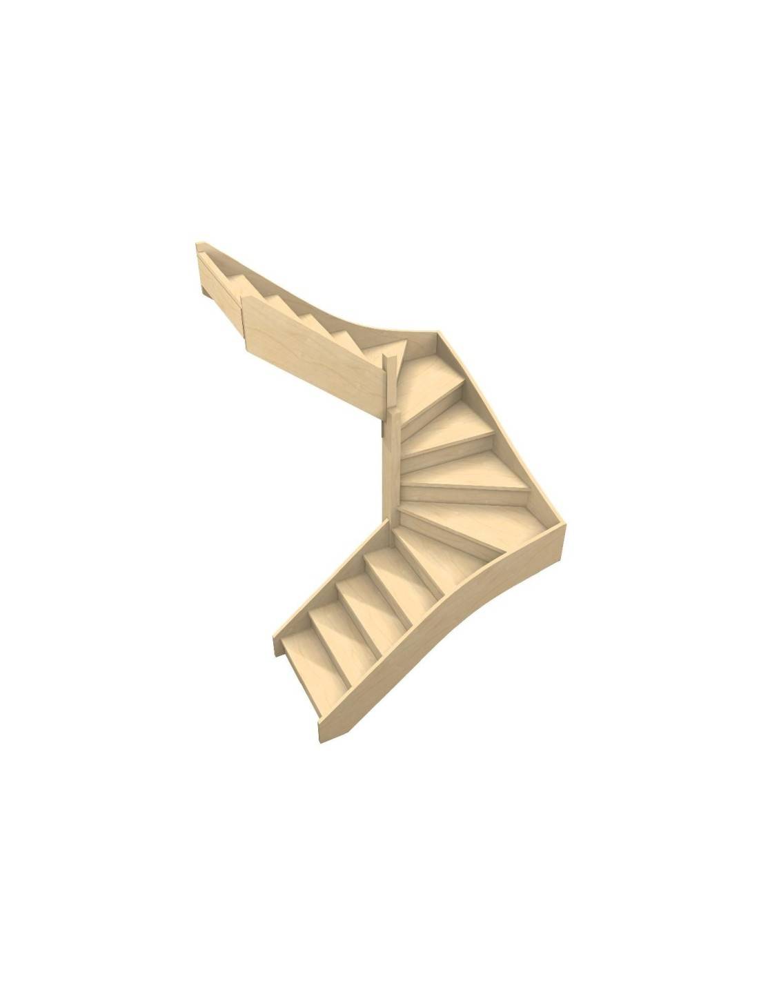 Questa scala a doppia curva in faggio o rovere lamellare-incollato è progettata per gli ambienti interni che richiedono una salita comoda e un ingombro ottimizzato. La sua geometria a due curve consente di integrare la scala in configurazioni di vani scala vincolanti, mantenendo al contempo una progressione regolare grazie a un pedata di 21 cm e un'alzata di 19 cm. La lavorazione in laboratorio garantisce un incastro stabile tra limoniere, gradini e pali. L'altezza piano-piano di 285 cm è regolabile in cantiere per adattarsi con precisione al livello finito. La scala è consegnata senza ringhiera interna: se si desidera una ringhiera, deve essere acquistata separatamente e installata contemporaneamente per garantire un corretto allineamento. Questo modello risponde alle ricerche relative alle scale a doppia curva, alla scelta tra faggio e rovere e alle soluzioni di ottimizzazione degli spazi interni.