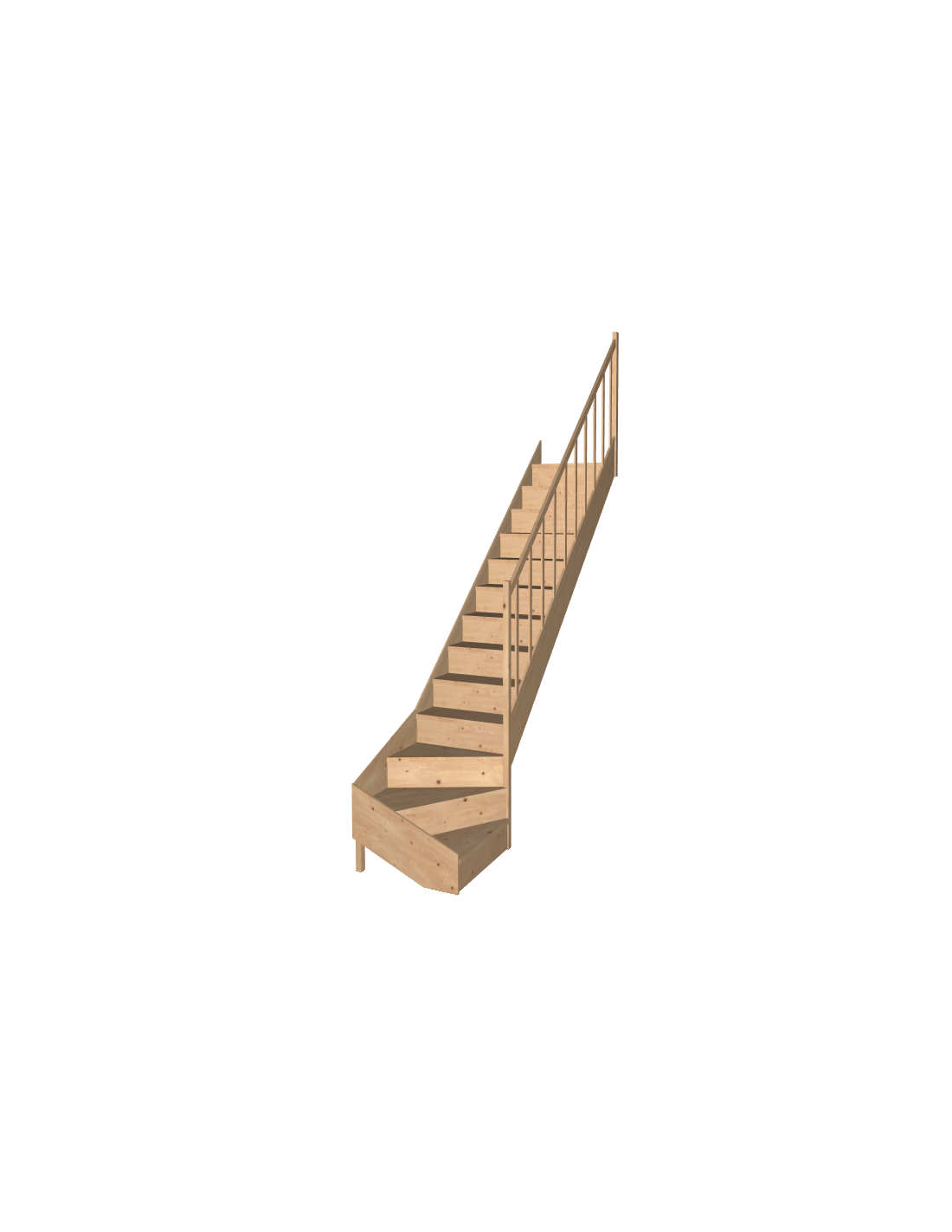 Installate la scala su un pavimento stabile e verificate le dimensioni del vano prima del montaggio. Poiché il legno è grezzo, si consiglia di applicare una protezione (vernice, olio o pittura) prima della posa. Assemblate prima i longheroni, poi i gradini dritti e il quarto di giro. Assicuratevi di fissare correttamente il corrimano per garantire la sicurezza d'uso.