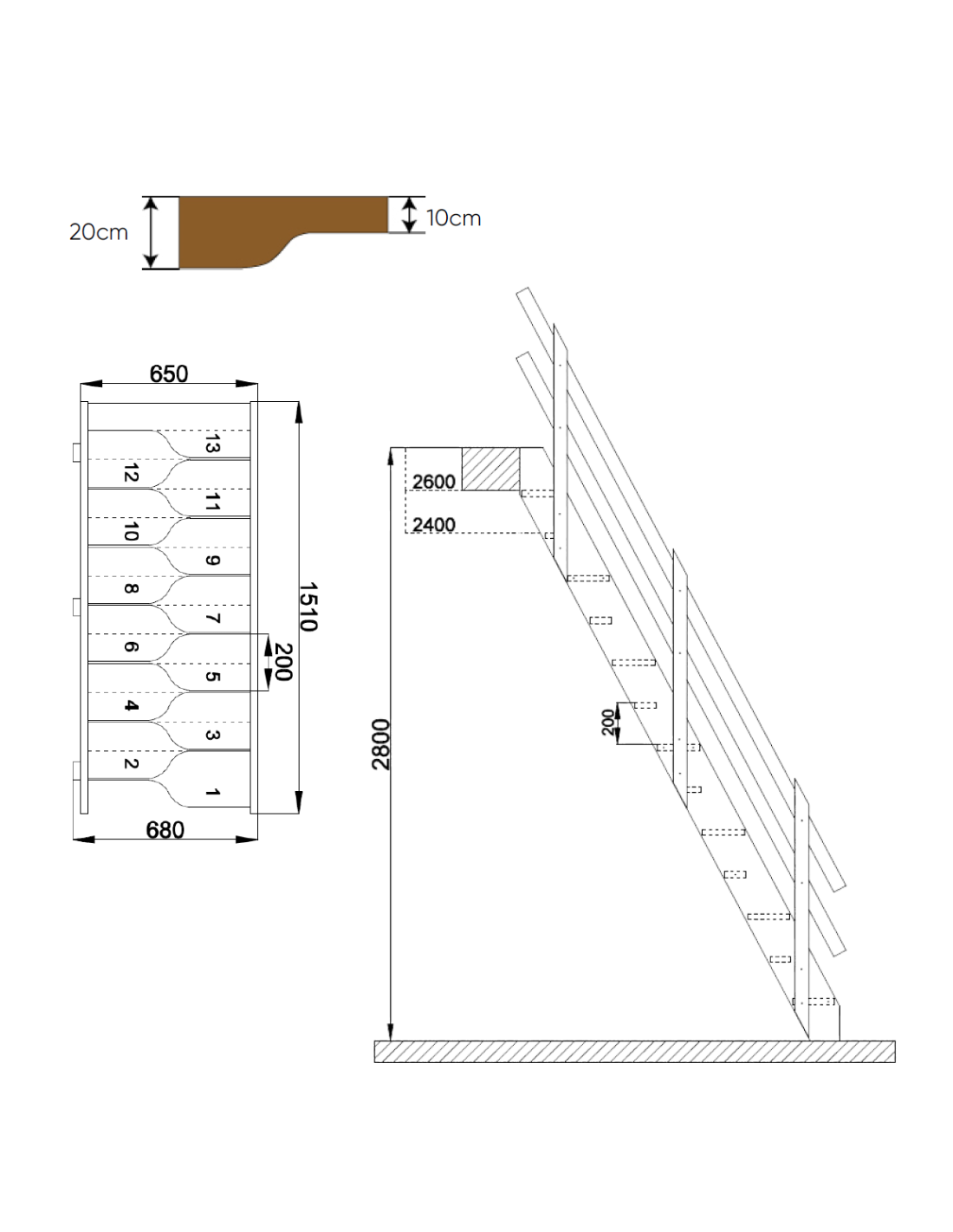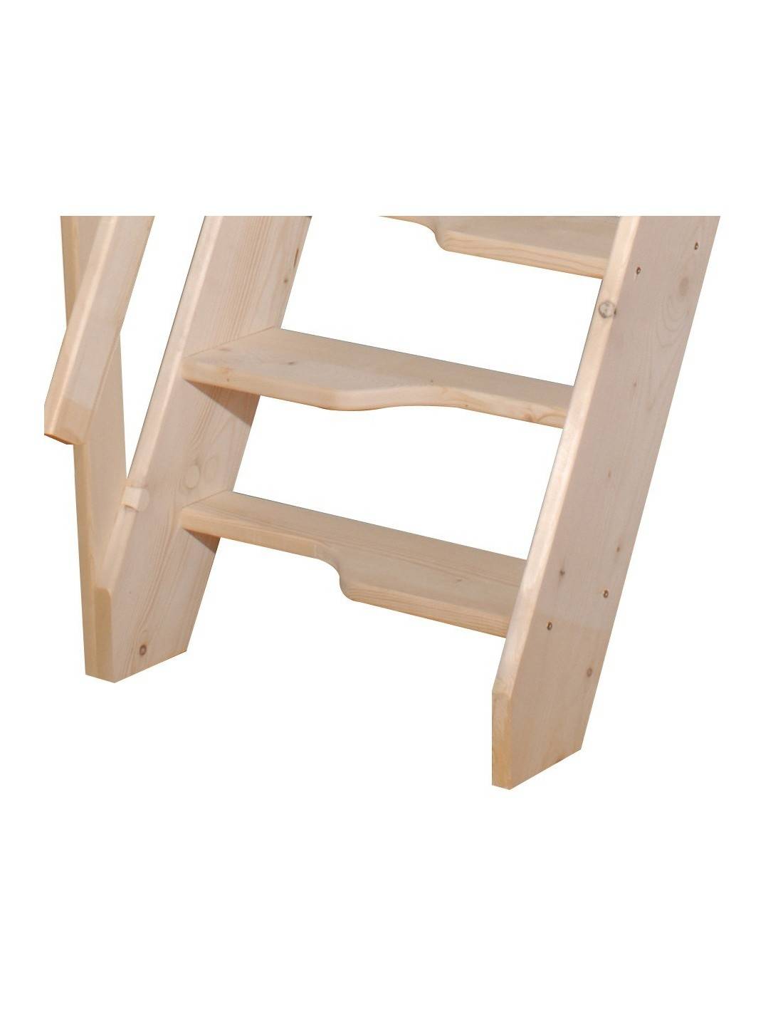 Scala salvaspazio consegnata in kit, altezza 280 cm. 13 gradini, larghezza 680 mm, vano consigliato Lunghezza 1 550 mm (abete) o 1 700 mm (faggio) x larghezza 730 mm (con ringhiera). Disponibile con o senza ringhiera.